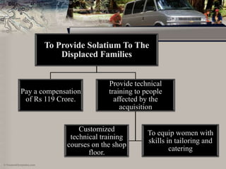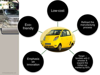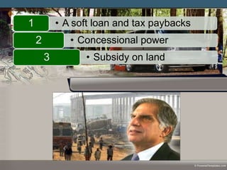 This document provides a strategic profile of the Tata Nano car project in West Bengal. It discusses the background of the project including Tata Motors' goal of producing a $2,000 car for the Indian market and their agreement with the West Bengal government to set up a manufacturing plant. It summarizes the key issues around land acquisition from local farmers and the resulting political opposition led by Mamata Banerjee. An internal, external, competitor and SWOT analysis is also provided. The document concludes by outlining Tata's decision to move the project to Gujarat due to delays and discusses the strategic benefits of this alternative location.