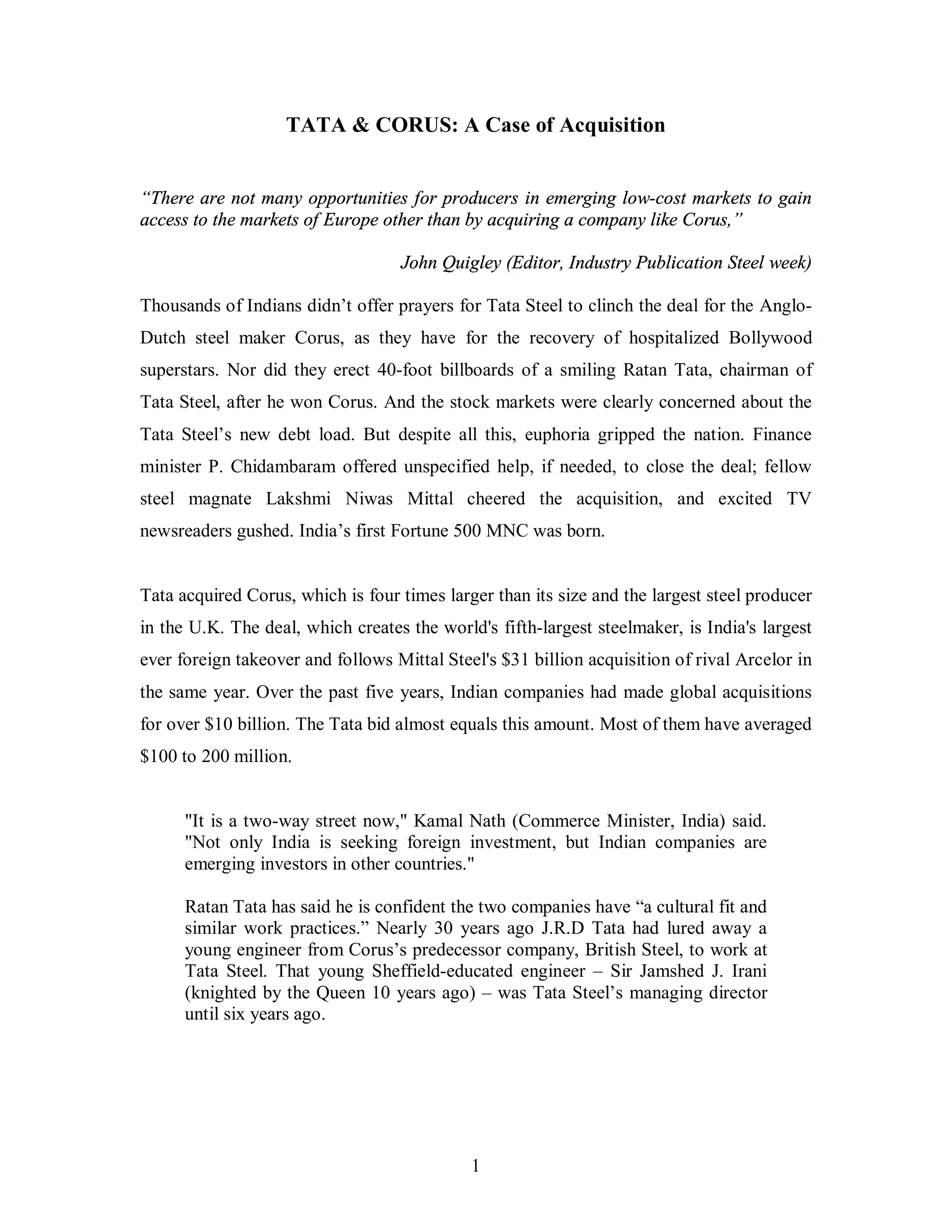 Tata acquired Corus, the largest steel producer in the UK, for $12 billion. This created the world's fifth largest steelmaker and was India's largest foreign acquisition. The deal was controversial due to Corus' larger size and Tata taking on significant debt. However, Tata believed there was a strategic and cultural fit between the companies that could provide synergies. The acquisition process took over a year, with Tata eventually outbidding a Brazilian firm after an auction conducted by the UK Takeover Panel. Following the acquisition, Tata formed an integration committee with representatives from both companies to oversee combining the businesses.