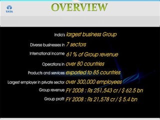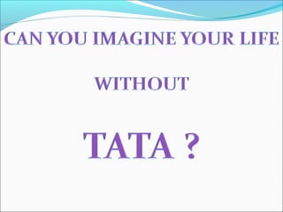 Jamsetji Tata founded the Tata Group in India in 1868. He established several companies that formed the basis of the business conglomerate. The Tata Group is now led by Ratan Tata and includes many industries such as steel, automobiles, IT, and hospitality. The group focuses on improving communities and has core values of integrity, understanding, excellence, and responsibility.