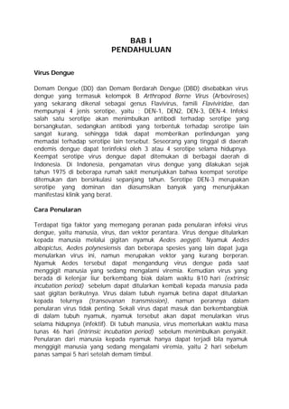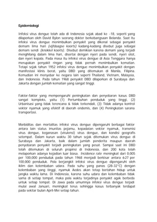 Dokumen tersebut membahas tentang virus Dengue dan epidemiologinya di Indonesia. Virus Dengue merupakan penyebab Demam Dengue dan Demam Berdarah Dengue, yang menginfeksi manusia melalui gigitan nyamuk Aedes. Prevalensi kasus Dengue di Indonesia telah meningkat pesat dalam 30 tahun terakhir seiring pertumbuhan penduduk dan urbanisasi.