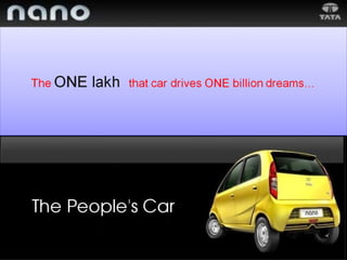 The document discusses the marketing strategy of Tata Nano, a small and affordable car introduced by Tata Motors in 2008. It details the history and specifications of the Nano, as well as its pricing, promotion, distribution, SWOT analysis, and post-purchase service strategy. The goal of the Nano was to make car ownership possible for lower-income families in India by offering a very low price point of around $2,500.