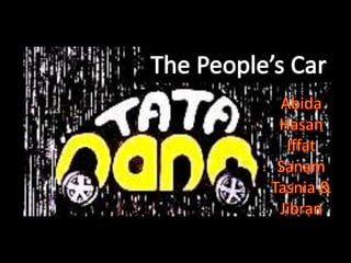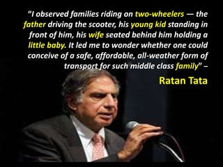 Ratan Tata observed families riding on scooters with young children standing in front and wives sitting behind holding babies, which led him to envision a safe, affordable form of family transportation. The document then provides details on Tata Motors' market share in various automobile segments in India, including commercial vehicles, two-wheelers, three-wheelers, and cars. It discusses the Tata Nano's positioning as a low-cost car targeted at lower-income families, students, the elderly, and entry-level professionals seeking an affordable option. The marketing strategies discussed include showrooms, dealerships, financing options, social media, advertising, sales promotions, direct marketing, and public relations.
