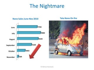 The document discusses the marketing challenges faced by the Tata Nano, highlighting key issues such as safety concerns, financing difficulties, and negative perceptions that have impacted sales. It includes findings from a survey on dealer and owner perceptions, emphasizing the need to reposition the Nano as an appealing vehicle for middle-class families and professionals. The marketing strategy includes targeted advertising through various media channels and a unique sales promotion to boost interest in the car.