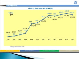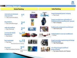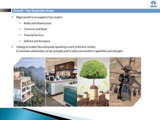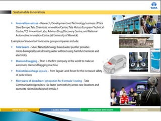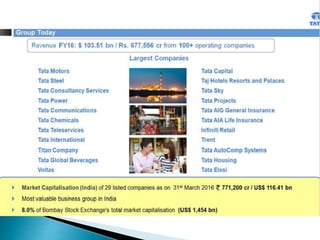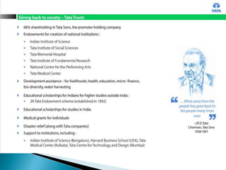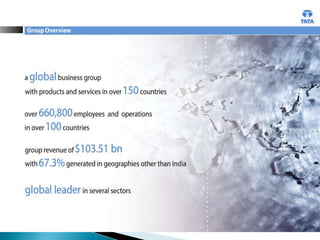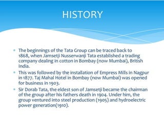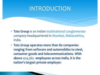 The document provides an overview of the Tata Group, an Indian multinational conglomerate holding company headquartered in Mumbai, India. It discusses the group's history and founding, sectors and companies, acquisitions, awards, philanthropy, and some controversies. The Tata Group operates in over 100 countries across seven business sectors and has over 100 operating companies. It is one of the largest private sector employers in India.