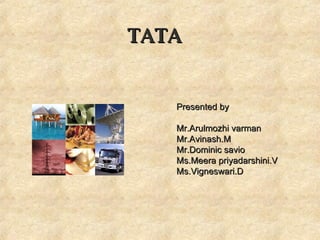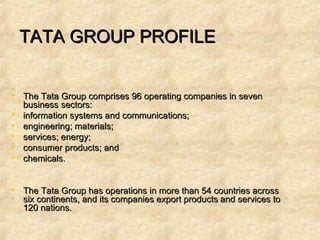 The Tata Group is one of India's largest and most respected business conglomerates comprising 96 operating companies across seven business sectors. It has operations in over 54 countries and exports products and services to 120 nations. Established in 1868, the Tata Group employs over 246,000 people and includes major companies such as Tata Steel, Tata Consultancy Services, Tata Motors, and Tata Tea. The Group is guided by five core values and aims to improve the quality of life of communities through leadership in key business sectors.
