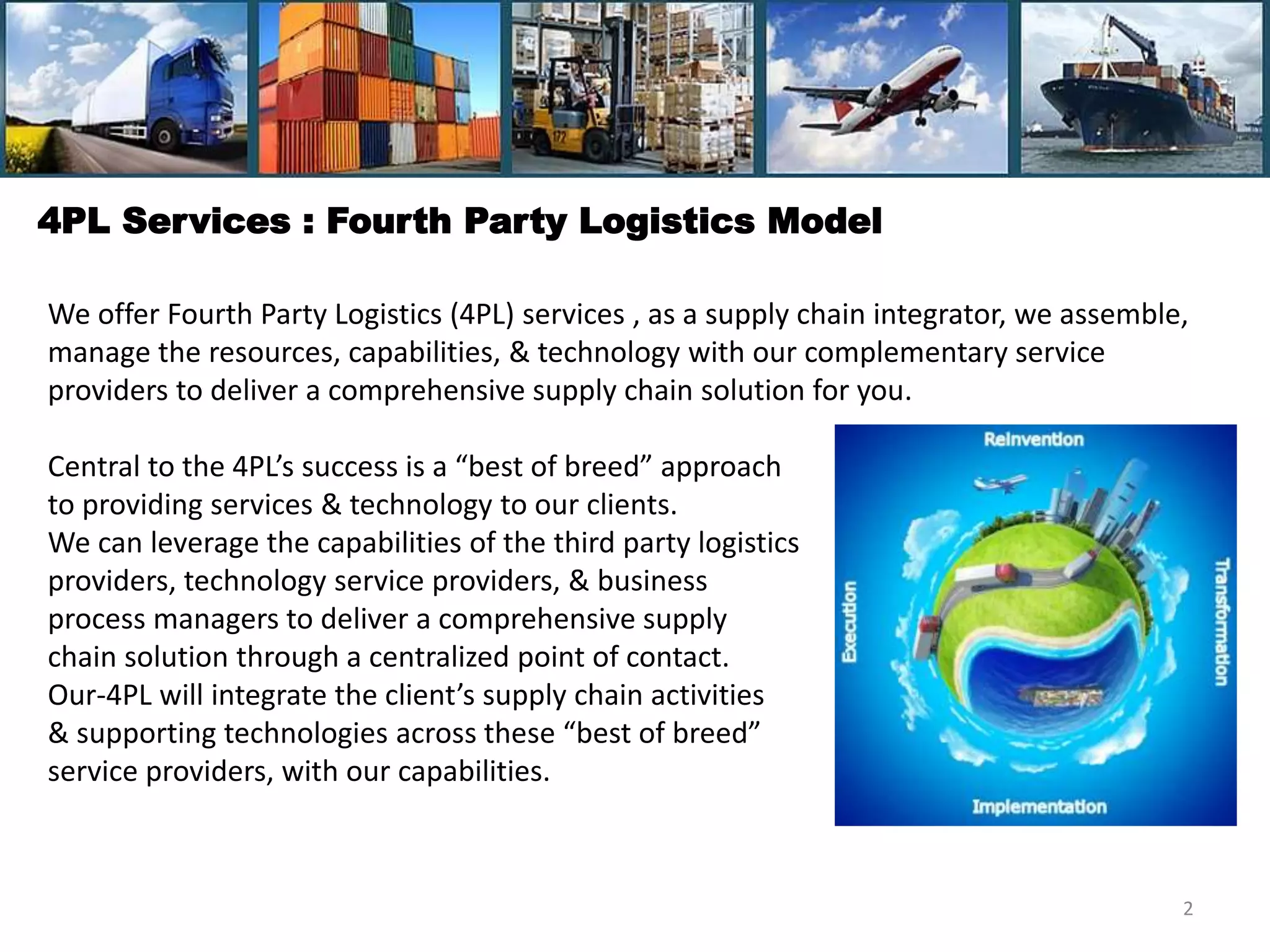 Our 4PL model integrates client supply chain activities and supporting technologies through various best-in-class service providers to deliver comprehensive supply chain solutions. As a 4PL, we assemble resources and capabilities to manage a client's entire supply chain without owning assets ourselves. Our end-to-end technology solutions provide visibility into asset location and performance to optimize operations and improve delivery compliance.