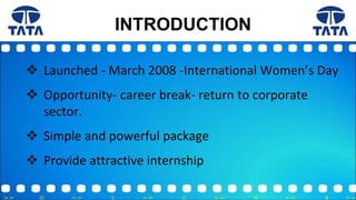 The Tata Second Career Internship Programme (SCIP) was launched in 2008 to provide career opportunities for women returning to the workforce after a career break. SCIP offers attractive internship projects between 3-6 months with potential for full-time roles. It aims to increase employee retention and productivity while benefiting from experienced talent. The programme helped women like Priyamvada Merchant and Anu Unnikrishnan regain their confidence and professional skills after long breaks to care for families. Similar returnship programmes have also been adopted by other large companies to bring back skilled women.