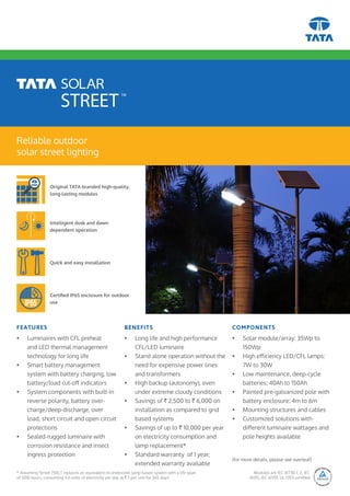 The document outlines the features and benefits of Tata Power Solar's outdoor solar street lighting systems, emphasizing their reliability, cost-effectiveness, and high-performance technology. These systems include advanced battery management, protective components, and various specifications suited for different applications while promoting significant savings on installation and electricity costs. Tata Power Solar aims to expand solar energy access through efficient and customized solutions, backed by over 25 years of experience and a nationwide support network.