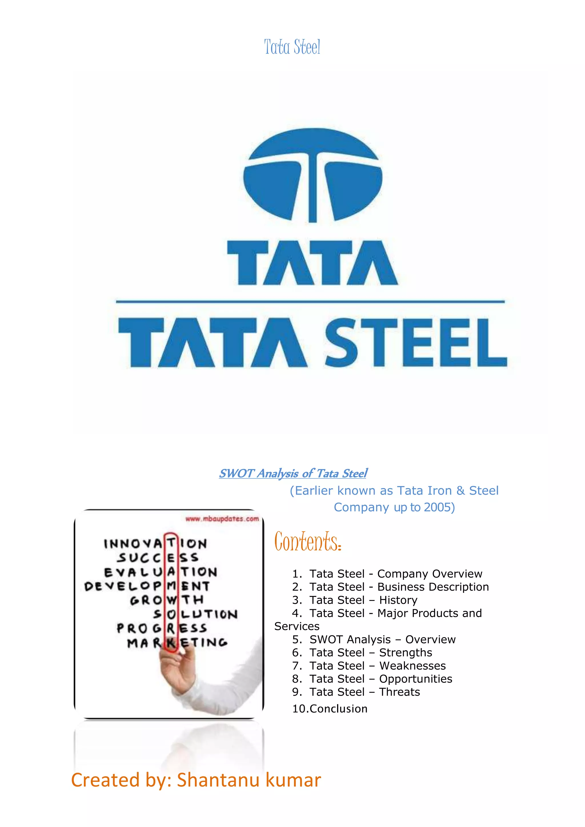 Tata Steel is one of the largest steel companies in the world, with operations across five continents. It was established in 1907 and is headquartered in Jamshedpur, India. The document discusses Tata Steel's history, products, strengths, and performs a SWOT analysis. Some of Tata Steel's key strengths include its large mineral reserves in India, investments in information technology, a credible management team, brand value as part of the respected Tata Group, and a focus on sustainability and corporate governance.