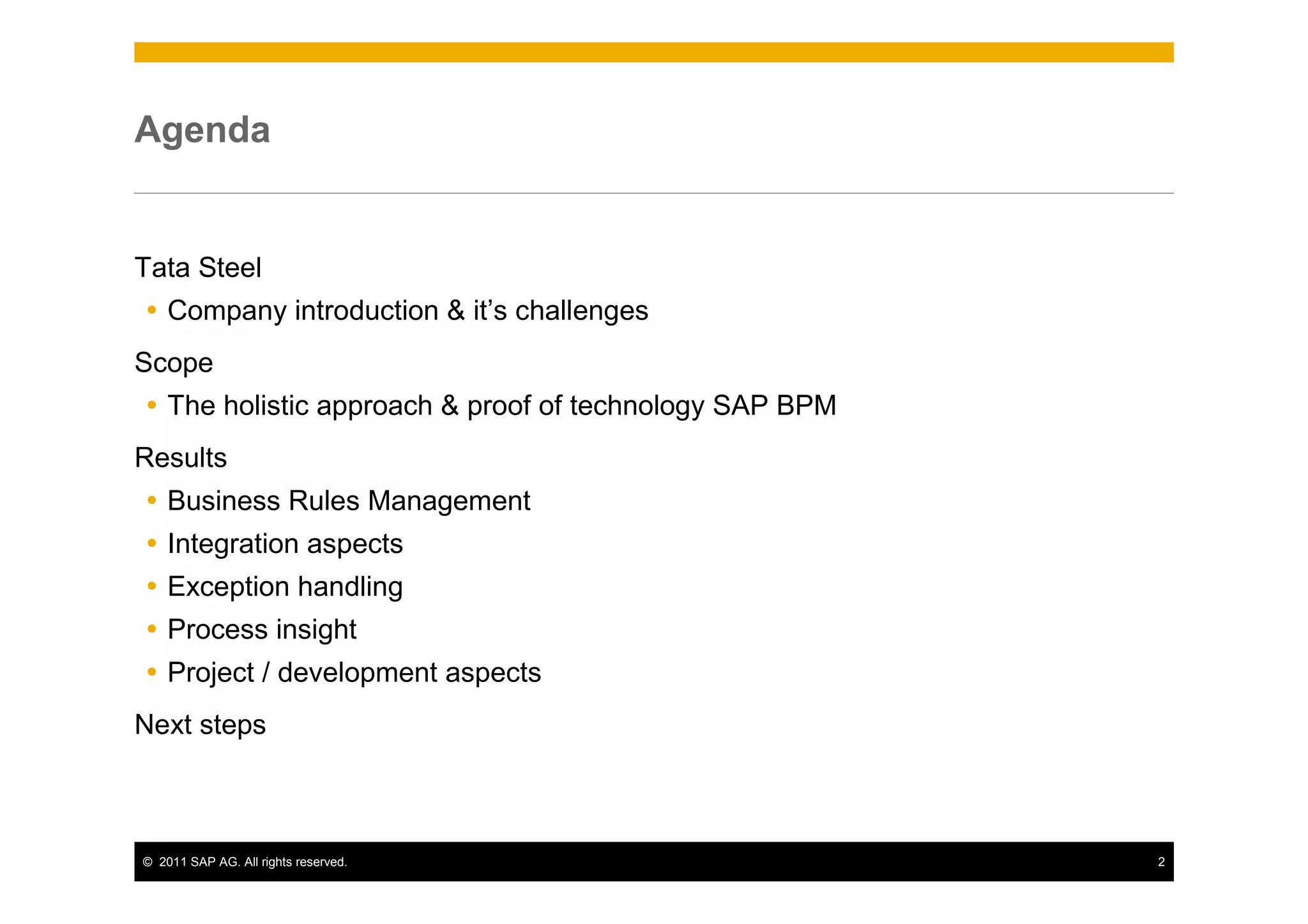 The document outlines Tata Steel's approach to continuous improvement using SAP BPM as part of its enterprise architecture. It highlights challenges in business processes and IT environment, demonstrates a proof of technology for process automation, and discusses next steps for further integration and project involvement. Key results include process flexibility, integration aspects, and exception handling, with a focus on embedding BPM into Tata Steel's organizational framework.