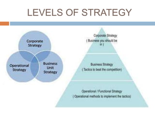 This document discusses the different levels of strategy employed by Tata Group, including corporate, business, and functional strategies. It provides examples of Tata's growth, acquisition, joint venture, turnaround, divestment, differentiation, value innovation, R&D, operations, and sustainability strategies. Key strategies mentioned include Tata's alliance with NTT DoCoMo, acquisition of Corus and other companies, joint ventures with Starbucks and others, transforming Tata Power Delhi Distribution, and investing over 12,500 crore annually in R&D.