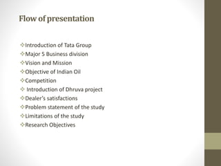 The internship report examines the brand preference and image of Tata Teleservices, focusing on customer behavior and preferences in Ahmedabad. It includes a review of Tata's history, corporate values, services offered, and a detailed research methodology involving data collection from 50 respondents. Key findings reveal customer satisfaction levels, brand loyalty, and significant relationships between demographic factors and consumer usage of Tata Teleservices.