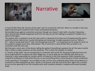 The document summarizes how a student media project opens with conventions of the psychological thriller genre. It begins in a hospital setting with an implied murder and suspicious doctor. Characteristics like the use of light and dark colors, fonts, and locations establish familiar thriller tropes. Editing techniques like echoing voices and vignettes add an ominous tone consistent with the subgenre. Overall, the opening establishes mystery and an untrustworthy male character through conventions of psychological thrillers.