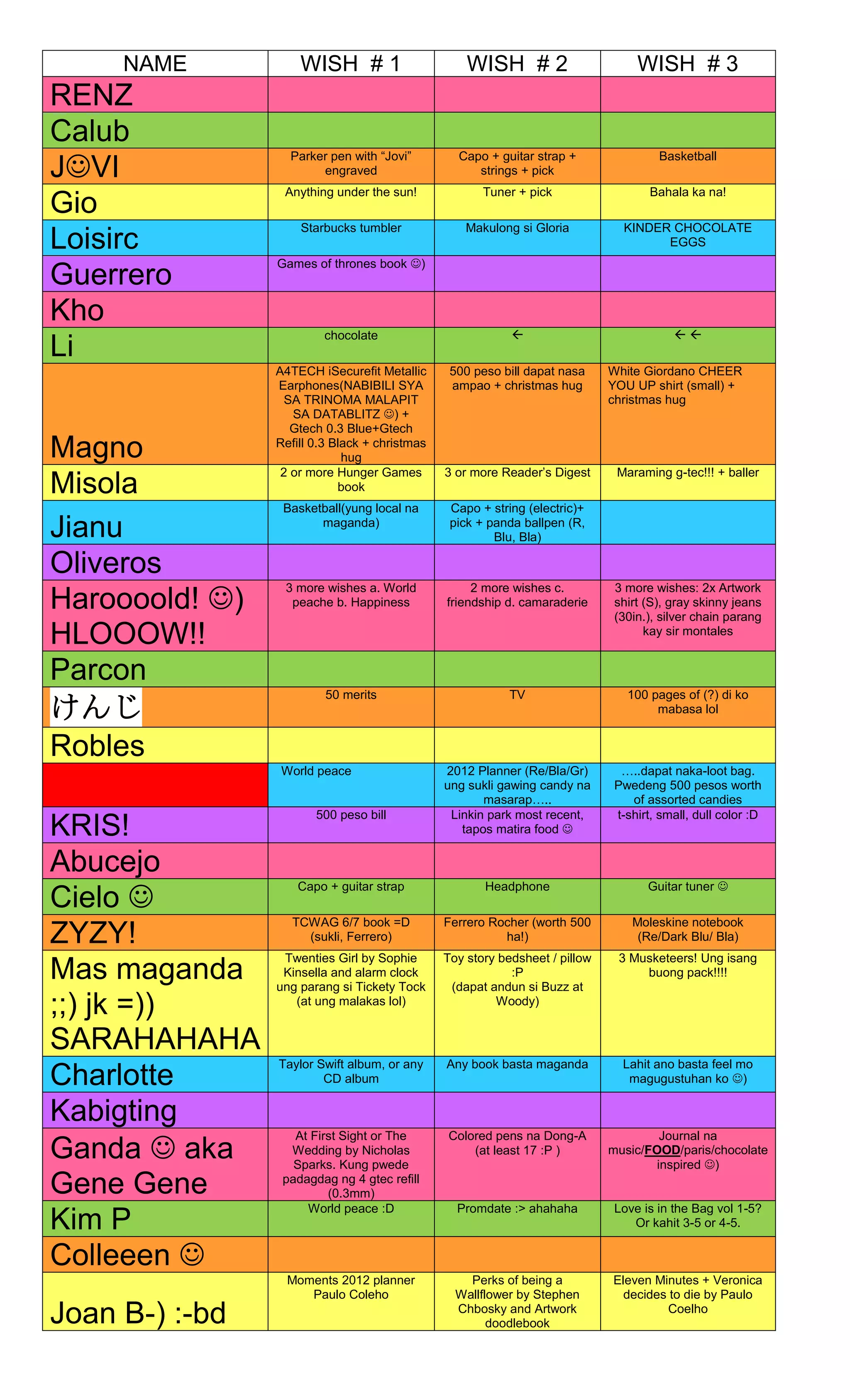 This document contains a list of wishes from different people. It includes wishes for items like pens, guitar accessories, books, food, clothing and more. Many people also wish for things like world peace, happiness or surprises. The wishes range from inexpensive candy and pens to more expensive electronics, albums and books.
