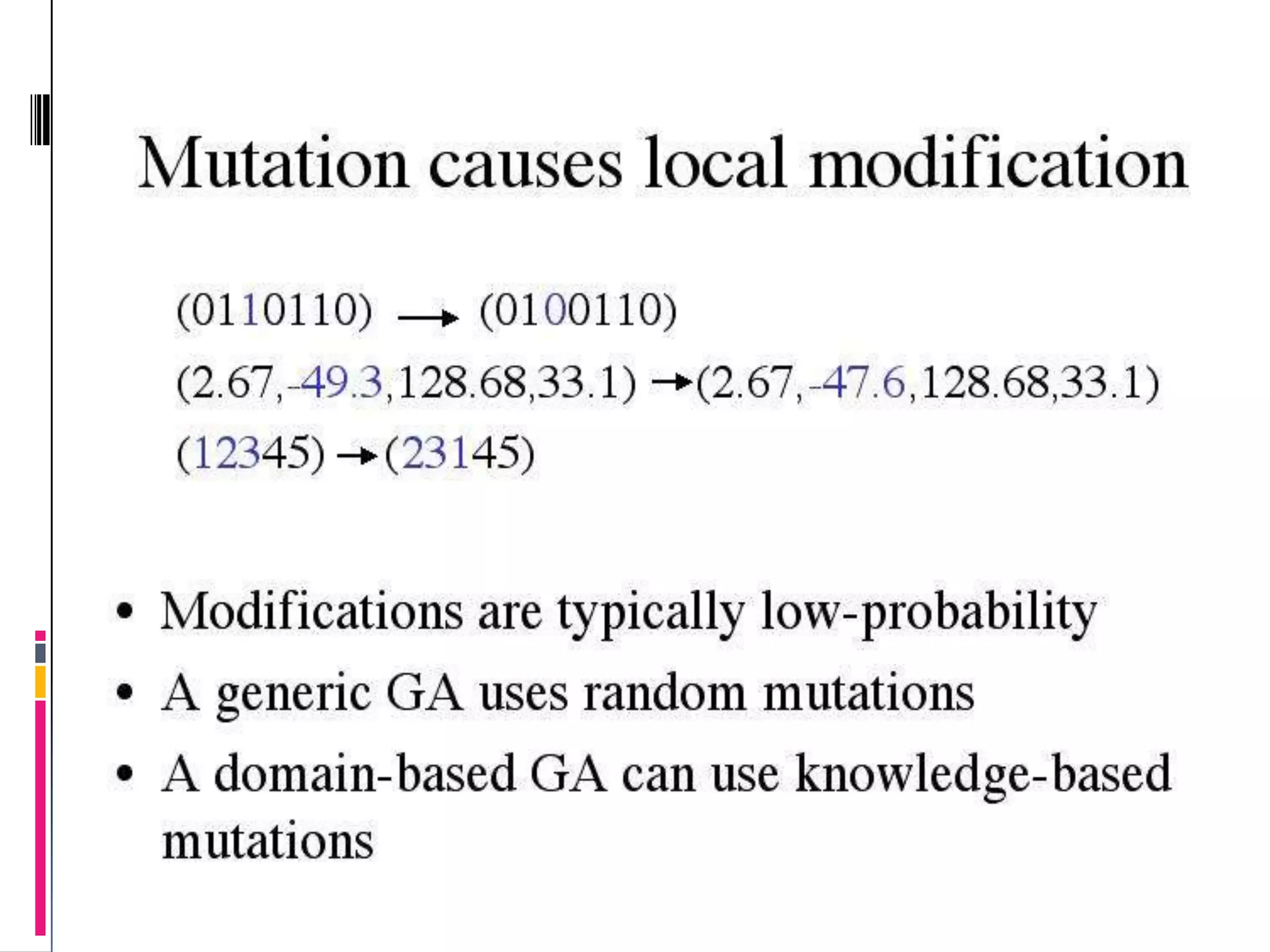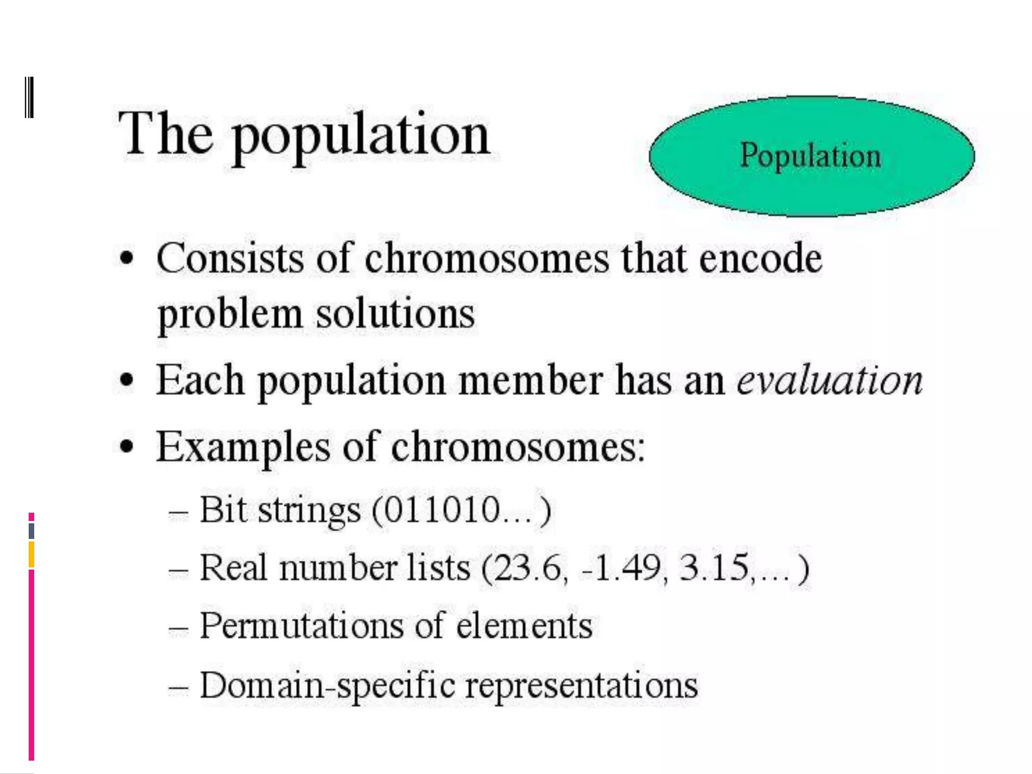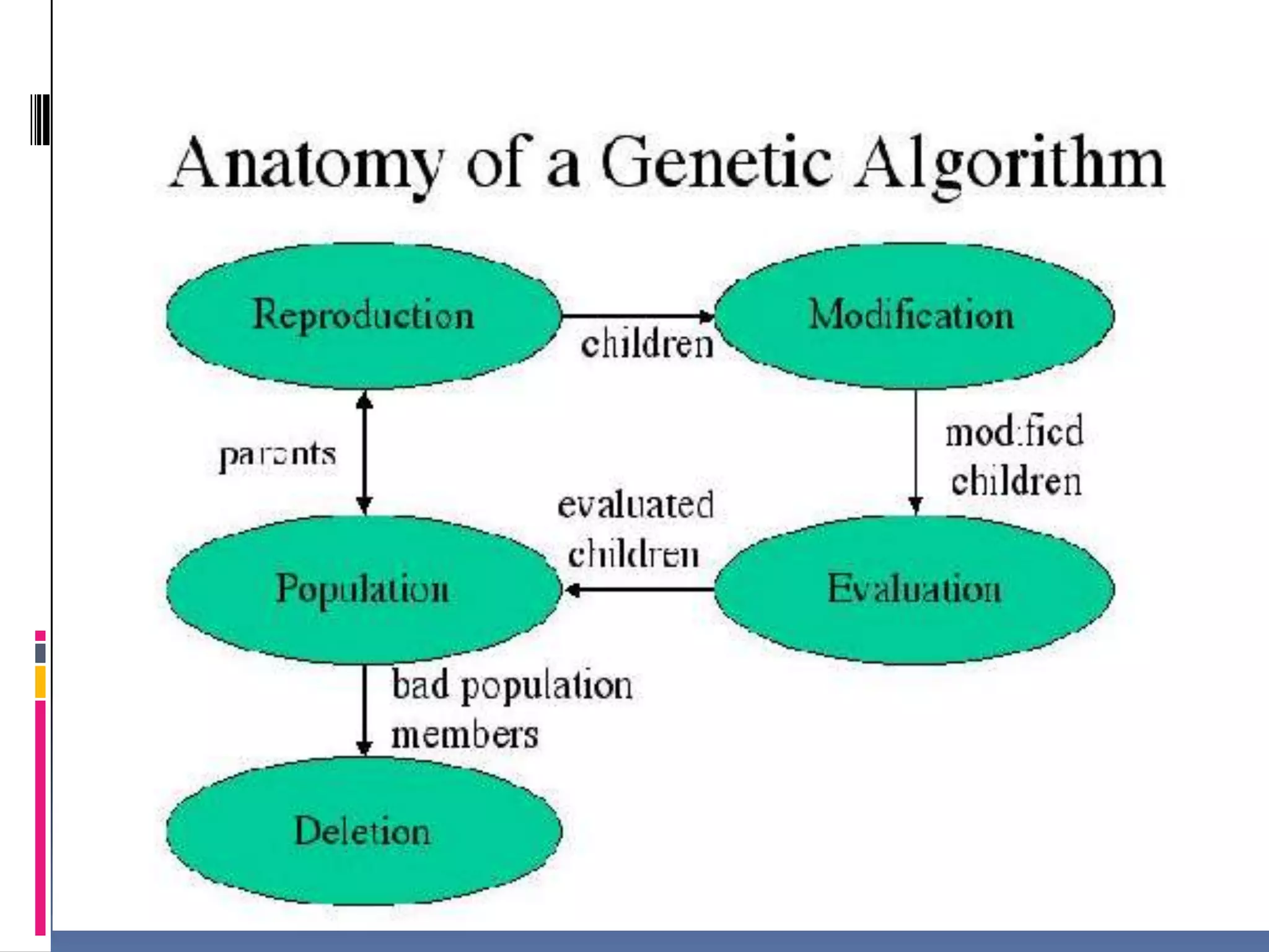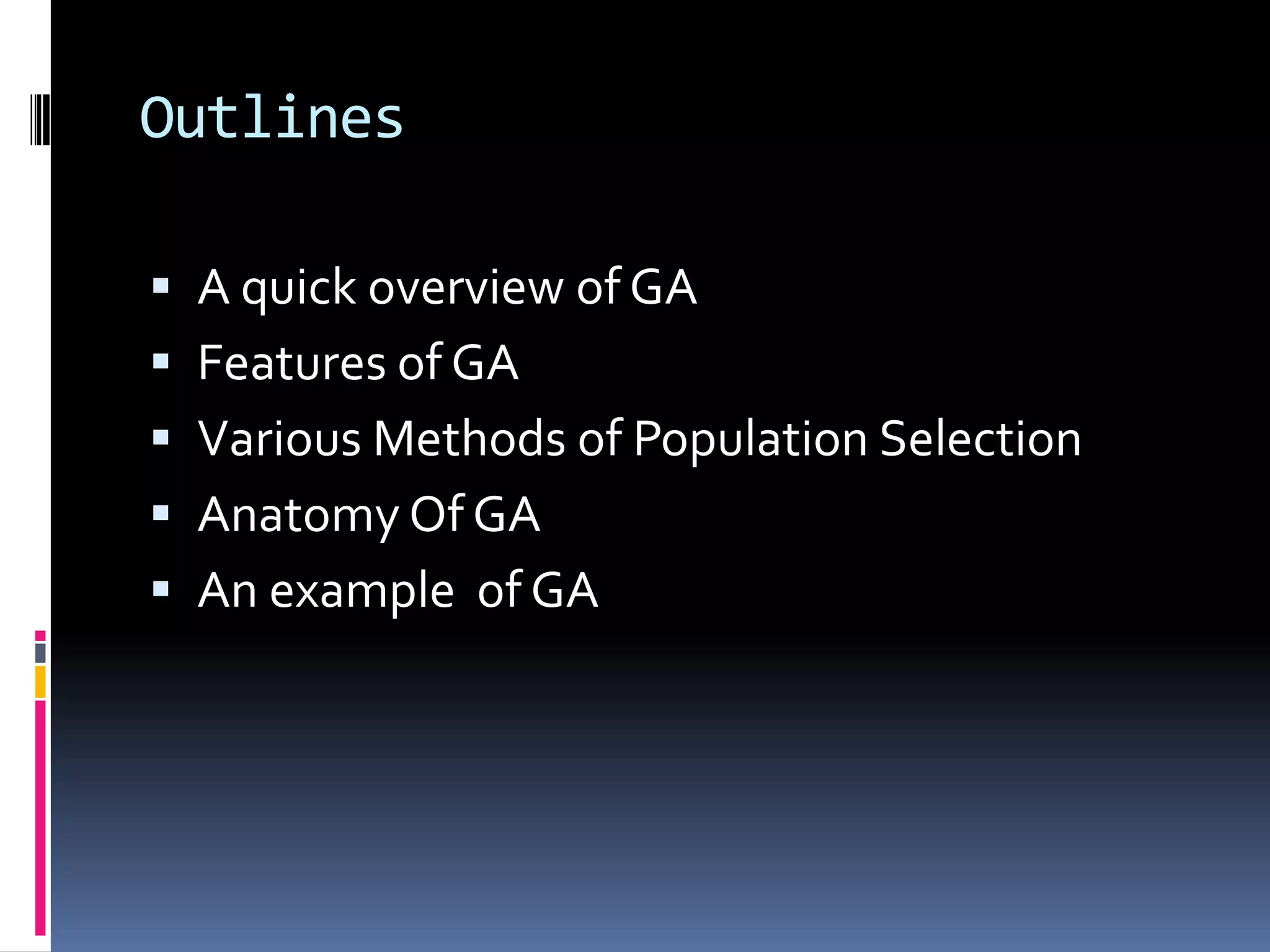 This document provides an overview of genetic algorithms. It begins with an introduction to genetic algorithms, noting they were developed in the 1970s, inspired by Darwinian evolution. It then describes key features of genetic algorithms, including that they maintain a population of solutions, use reproduction, mutation and crossover to create new populations, and favor fitter solutions. The document discusses various methods for population selection, including roulette wheel selection, rank selection and tournament selection. It also covers the anatomy of a genetic algorithm and provides a simple example to maximize x2 to demonstrate the genetic algorithm process.