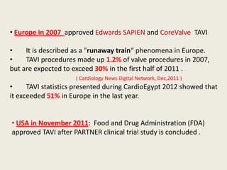 The document discusses transcatheter aortic valve implantation (TAVI), including its approval and increasing use in Europe and the United States. It provides details on the team approach, devices, procedures, outcomes, and complications of TAVI based on clinical trials such as PARTNER. TAVI is an alternative to surgical aortic valve replacement for high-risk or inoperable patients with severe aortic stenosis.