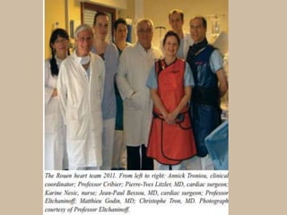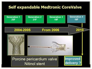 The document provides an overview of transcatheter aortic valve implantation (TAVI), including a brief history of its development, descriptions of the Edwards Sapien valve and delivery systems, approaches for TAVI, and complications. It also discusses patient screening and risk stratification, as well as newer valve devices that are being developed.