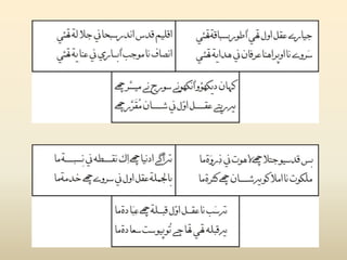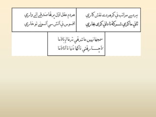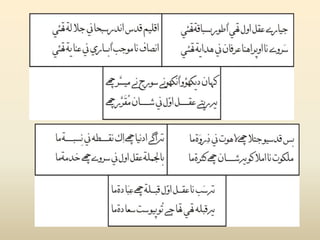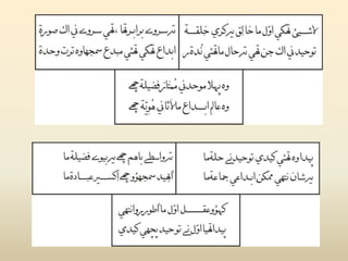 The document explores the concept of tawhid, emphasizing that it represents the essence and truth of faith, encapsulating the complete teachings from Nabi Adam to Khatamun Nabi Mohammad. It discusses the stages of spiritual growth, the importance of knowledge, and how true understanding comes from the love of Aqa Moula, as well as the necessity of pursuing ilm (knowledge) for spiritual ascent. Additionally, it reflects on existential questions about the purpose of creation and the nature of Allah, advocating for an inner stillness to comprehend spiritual truths.