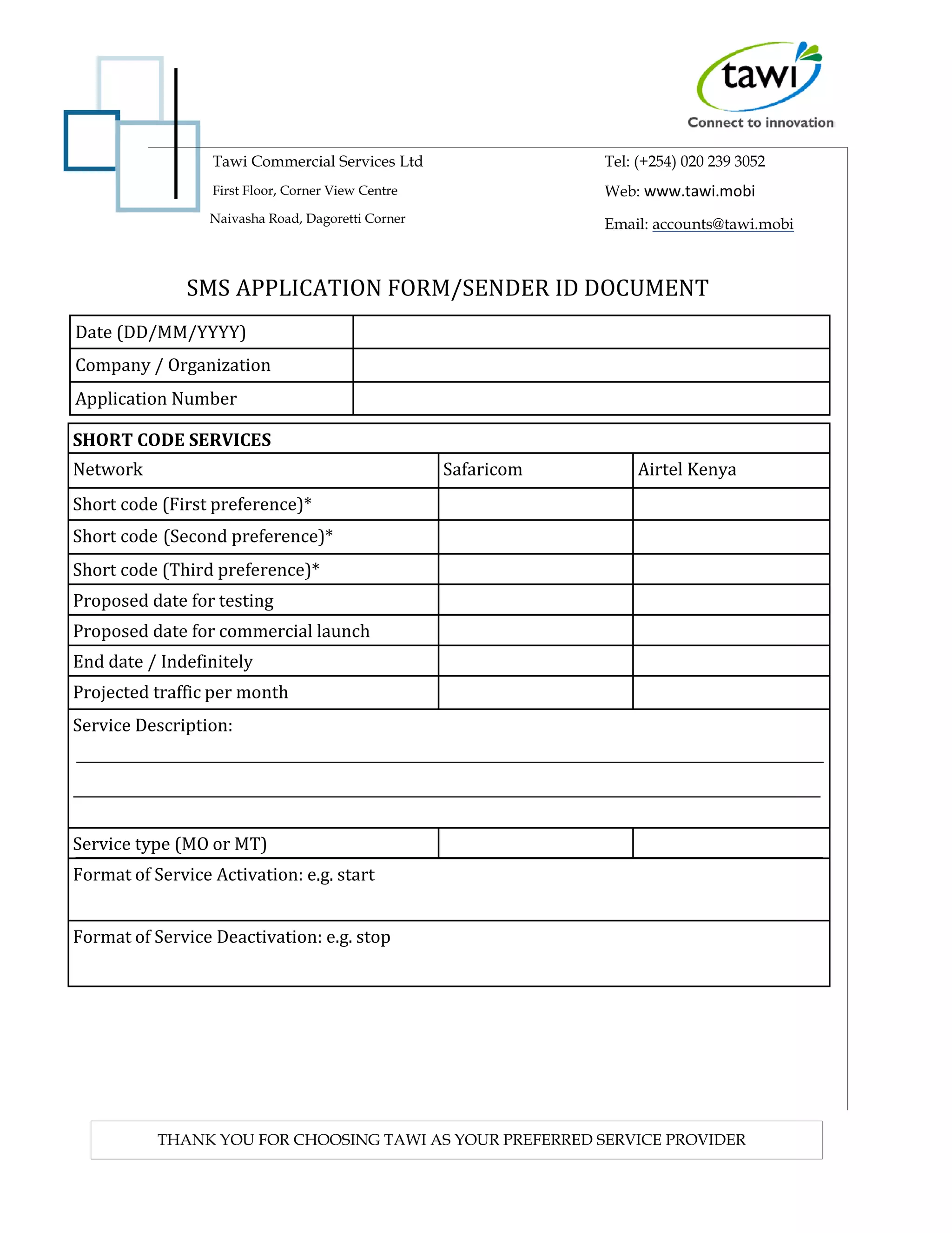 Tawi Commercial Services Ltd provides short code and bulk SMS services. This document is an application form for short code services and bulk SMS packages from Tawi. It requests information such as preferred short codes, proposed service dates, projected traffic volume, service description and key contacts. Upon completion, the form needs to be signed and stamped before submission to Tawi.