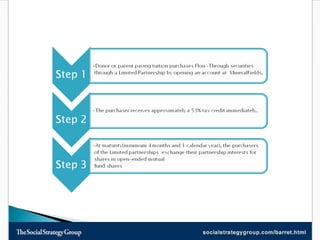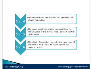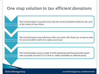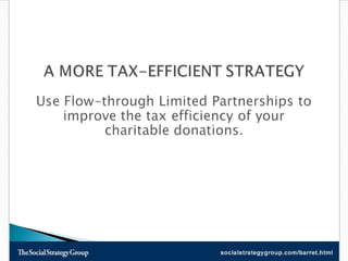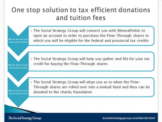 This document discusses tax efficient strategies for charitable giving, such as donating appreciated securities and investing in flow-through limited partnerships that provide tax deductions. Investing $10,000 in a mineral fields flow-through partnership and then donating the proceeds after maturity allows donors to claim both tax deductions and donation tax credits, maximizing their tax savings and benefits to charity. Pathway-MineralFields is highlighted as one of Canada's largest resource focused investment firms offering flow-through partnerships and mutual funds.