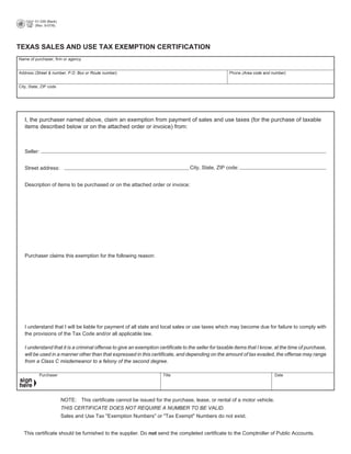 This document contains two Texas sales and use tax forms: a resale certificate and an exemption certification. The resale certificate allows a purchaser to buy items tax-free if they intend to resell the items. It requires the purchaser's contact information and description of the items. The purchaser agrees that if they use an item instead of reselling it, they will pay sales tax. The exemption certification is similar but for claiming an exemption other than resale, such as for government or charitable use. Both forms warn that misuse may be a criminal offense.