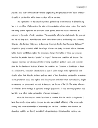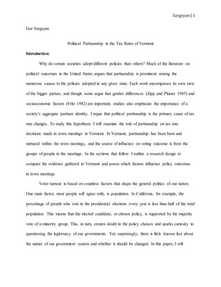 This document summarizes Gor Sargsyan's research on the influence of political partisanship on tax rates in Vermont. Sargsyan argues that partisanship is the primary cause of changes to tax rates. He plans to examine the role of partisanship in town meetings in Vermont, where locals decide on tax and policy issues. Previous literature suggests partisanship strongly influences political and economic behaviors. Sargsyan hypothesizes that towns voting Democrat will have higher taxes, while towns voting Republican will have lower taxes. He will analyze election and tax rate data from 1970-2012 to determine if patterns exist between a town's partisan affiliation and its tax rates.