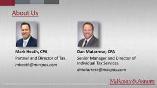 The document provides an analysis of the Tax Cuts and Jobs Act of 2017, detailing changes in individual and corporate taxes, including modifications to deductions, tax rates, and the introduction of the Qualified Business Income deduction. It outlines how these changes affect personal exemptions, standard deductions, business interest deductions, and the treatment of pass-through entities. Additionally, it highlights implications for C corporations, such as changes in tax rates and loss offsetting rules.