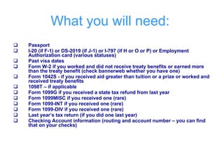 2) It outlines the documentation needed to file such as Forms W-2, 1042-S, 1099 and passport information.
