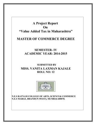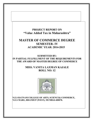 This document is a project report submitted by Miss Vanita Laxman Kajale to the N.E.S Ratnam College of Arts, Science & Commerce in partial fulfillment of the requirements for a Master's degree in Commerce. The report discusses Value Added Tax (VAT) implementation in the state of Maharashtra, India. It includes an introduction to VAT, details on VAT registration, calculation of tax liability, filing returns and payment procedures, record keeping requirements, and appeals processes in Maharashtra. The project was guided and reviewed by the lecturer Prof. Rajiv Mishra.