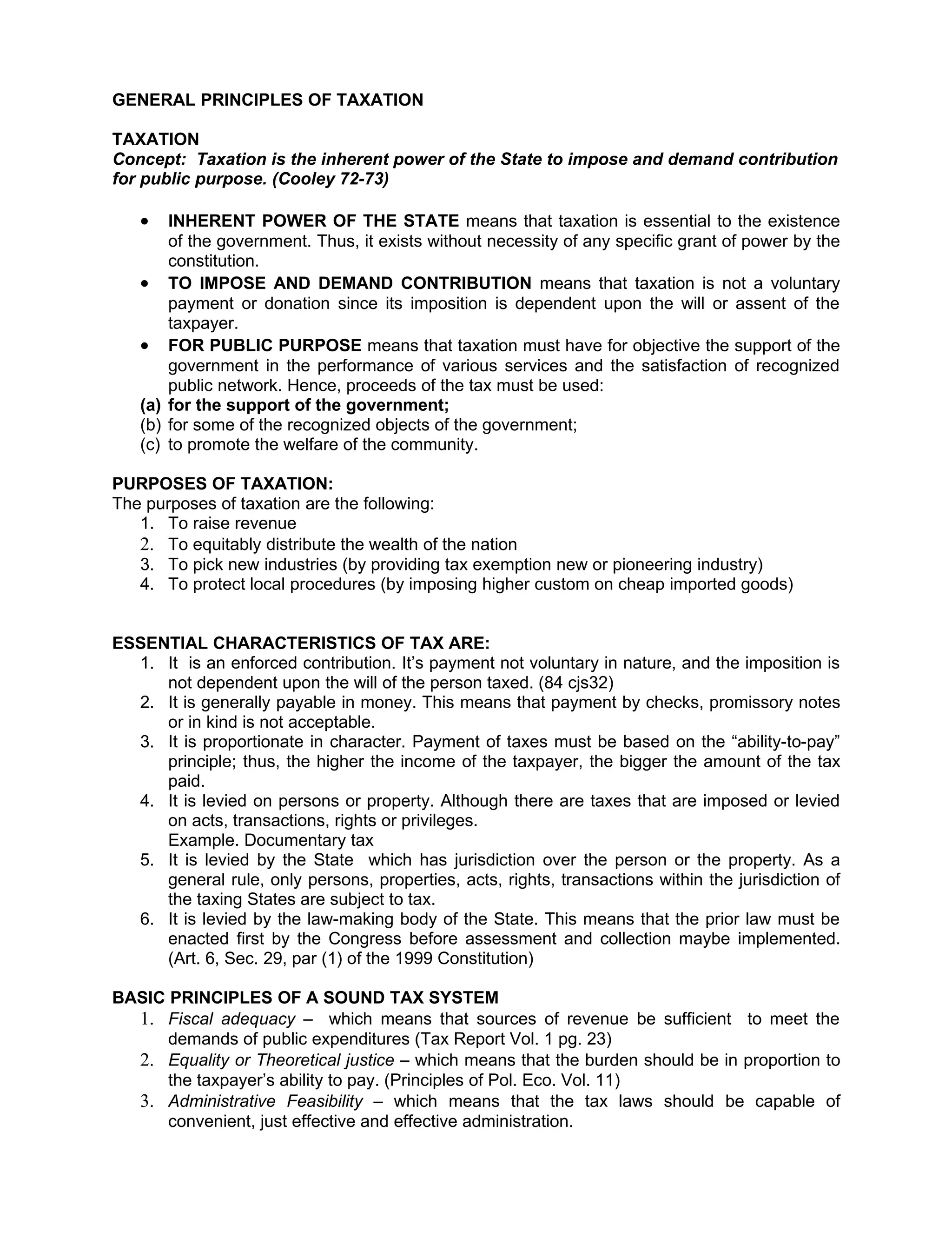 The document outlines general principles of taxation including that taxation is an inherent power of the state to impose contributions for public purposes. It lists the purposes of taxation as raising revenue, distributing wealth, promoting new industries, and protecting local industries. The essential characteristics of a tax include that it is an enforced contribution, generally payable in money, proportionate, and levied by the state on persons or property within its jurisdiction. A sound tax system has three basic principles - fiscal adequacy, equality or justice, and administrative feasibility. Taxes are classified based on subject matter such as personal taxes, property taxes, and excise taxes, and based on who bears the burden such as direct and indirect taxes. Certain entities like religious institutions are exemp