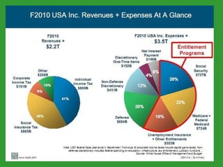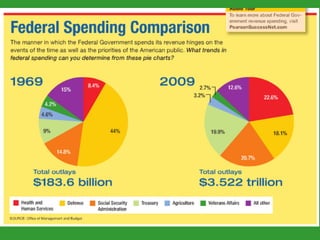The document discusses various aspects of taxes in the United States including the constitutional basis for taxes, different types of taxes such as direct, indirect, and progressive taxes, and how tax revenue is spent by the government. It also covers public debt and borrowing, including who the government owes money to and why it borrows.