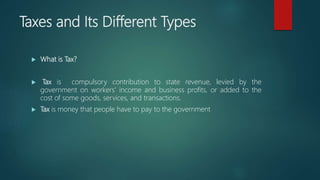 This document discusses different types of taxes. It describes direct taxes that individuals pay directly to the government, like income tax, versus indirect taxes that can be passed on to consumers. It also explains progressive taxes where high earners pay a greater percentage, regressive taxes where low earners pay a greater percentage, and proportional/flat taxes where all pay the same percentage. The document then provides details on specific taxes like property tax, sales tax, value-added tax, excise taxes on certain goods, and business/corporate taxes.