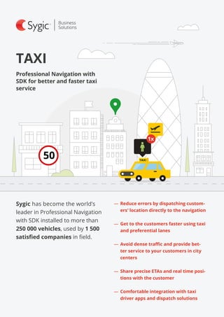 The document discusses Sygic's professional navigation software for taxis, which includes features like: