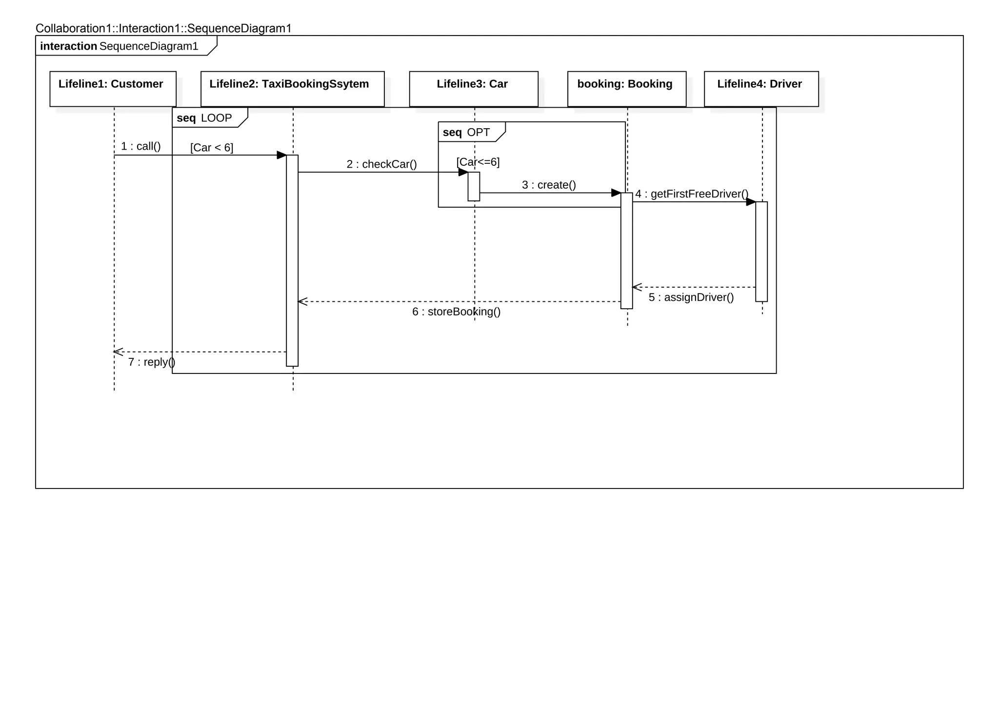 The document describes two interactions between a customer, taxi booking system, car, driver, and booking. The first interaction shows a customer calling the taxi booking system to request a ride when there are less than 6 cars available. The system then checks a car, creates a booking, gets the first free driver, and assigns the driver to the car before storing and confirming the booking. The second interaction checks for a car with at least 4 seats if the time is 1:00pm and less than 10 bookings have been made, and then performs similar steps of checking, booking, storing, and confirming.