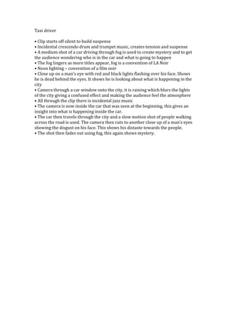 A taxi driver is shown driving through the foggy and rainy streets of LA at night. Close up shots of the driver's dead eyes and expression of disgust reveal his dark and mysterious character. Neon lights flash through the car window as jazz music plays, establishing the film noir atmosphere of mystery and tension as the audience wonders what will happen.