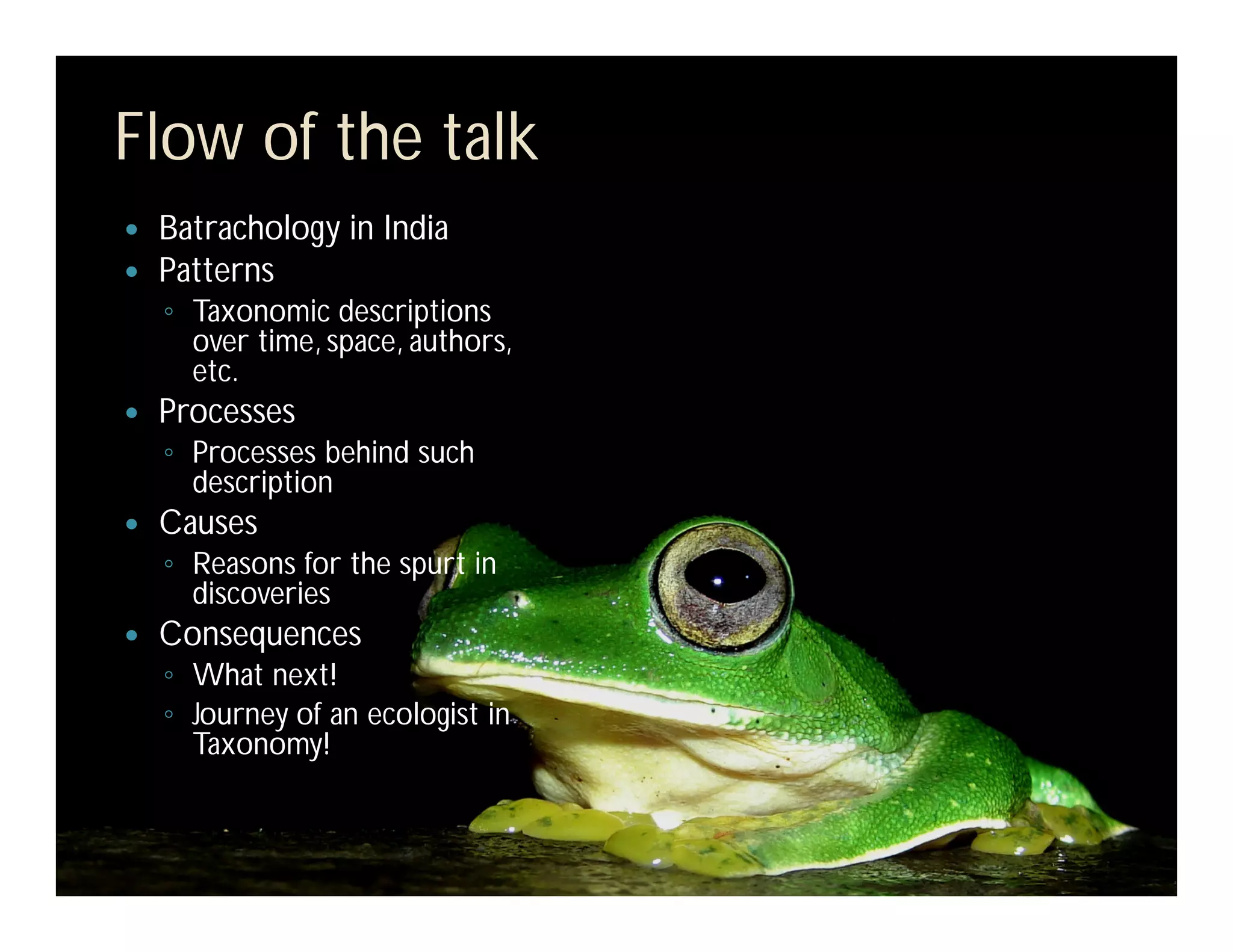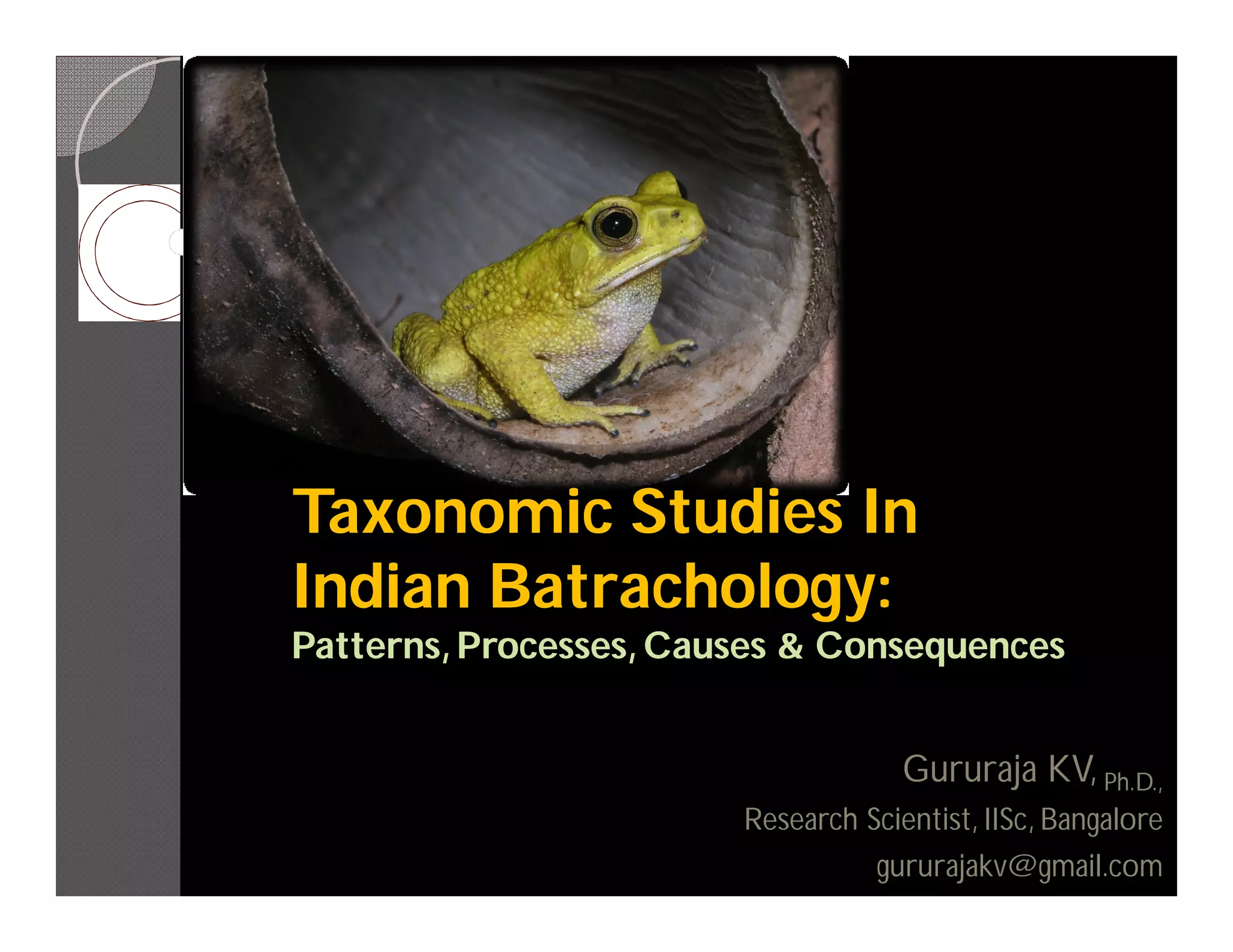 The document discusses the field of batrachology in India, covering its taxonomic patterns, research processes, causes for increased discoveries, and future implications. It highlights the current status of amphibian species in India, emphasizing the contributions of numerous researchers and the rising number of species descriptions since 2000. Additionally, it addresses challenges faced in taxonomy, the evolving nature of research, and calls for collaboration and technological integration in future studies.