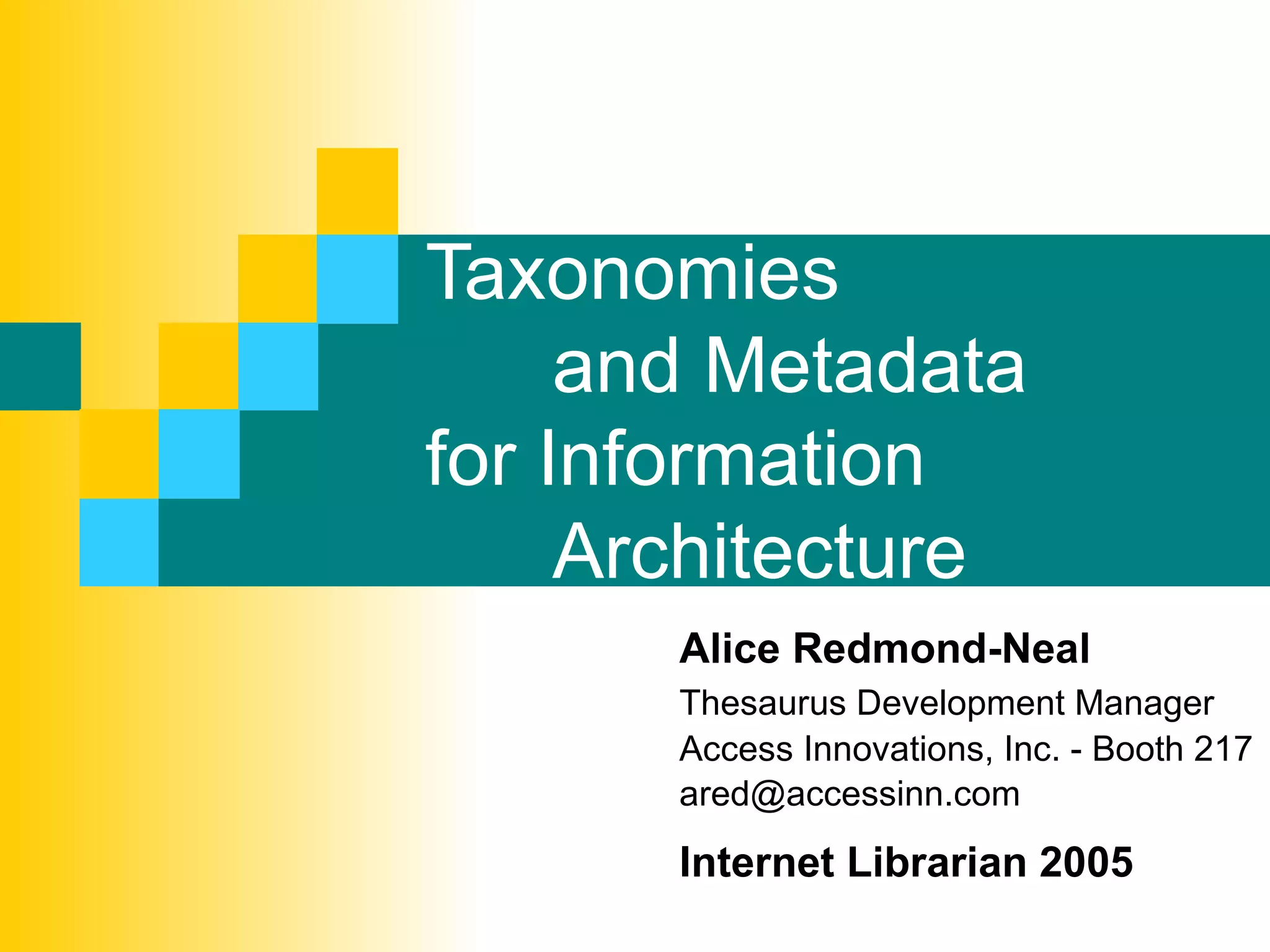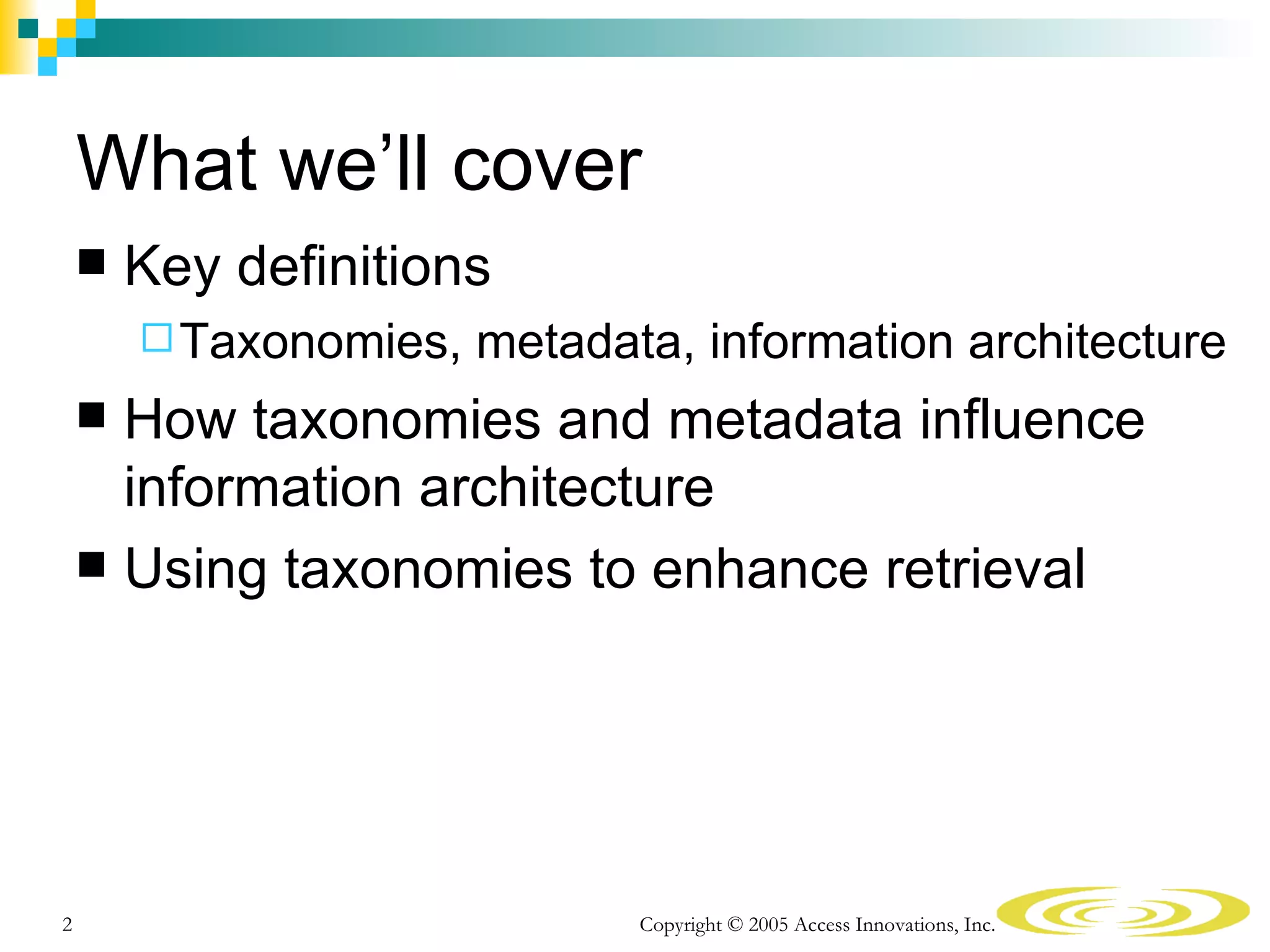 The document discusses the importance of taxonomies and metadata in information architecture, explaining how they aid in organizing content, enhancing information retrieval, and improving user findability. It defines key concepts related to taxonomies, metadata, and information architecture while highlighting their roles in creating efficient and user-friendly web environments. The content emphasizes that taxonomy-based metadata yields precise retrieval results, contributing significantly to search, labeling, and navigation.