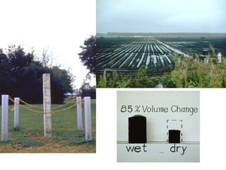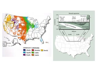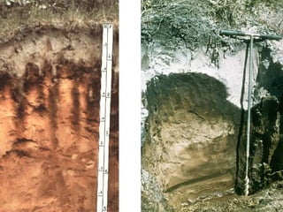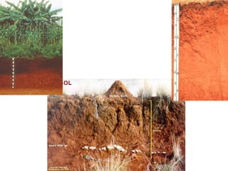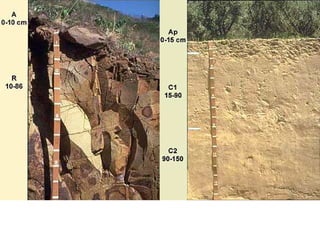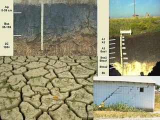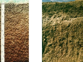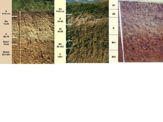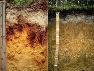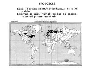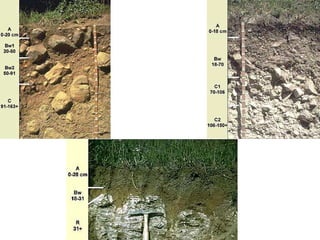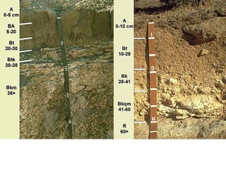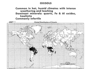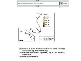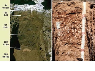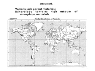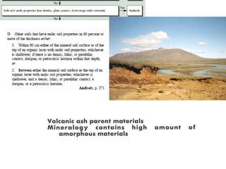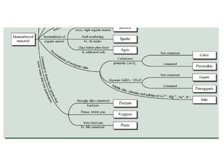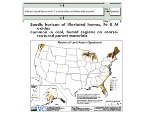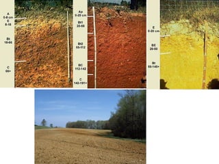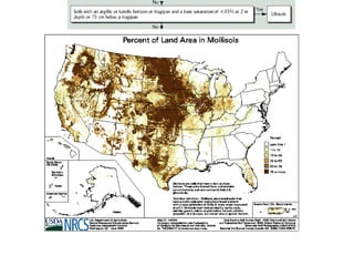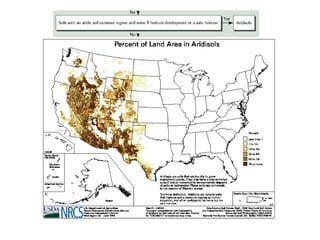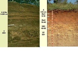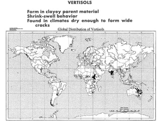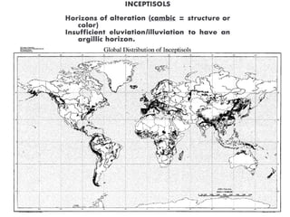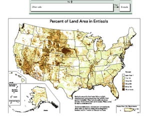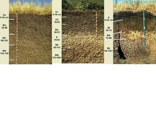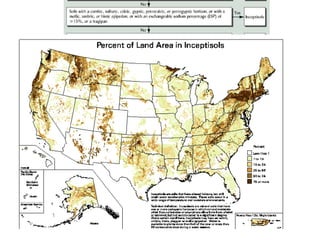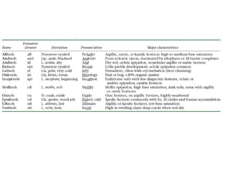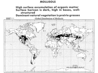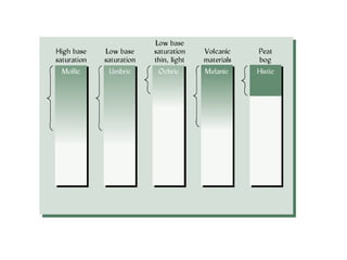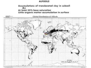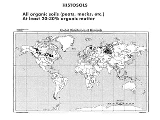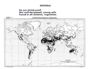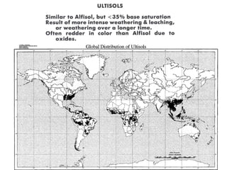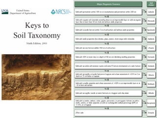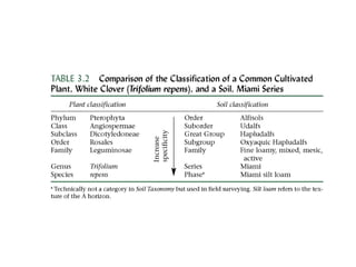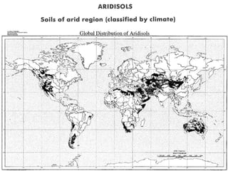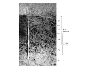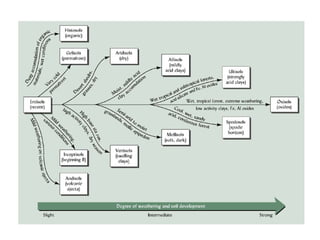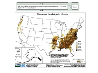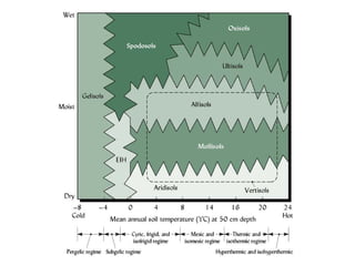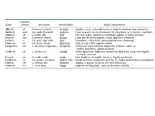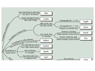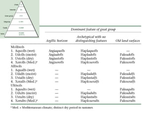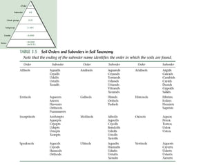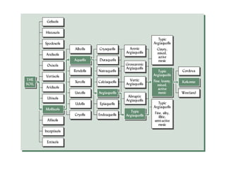 The document discusses soil classification systems. Soils are organized into groups based on observable properties to make the information understandable and usable. There are two main classification systems - natural systems which group soils based on how they formed, and technical systems which group soils based on characteristics like potential crop yields. The USDA's Soil Taxonomy is the main natural classification system, grouping soils globally into orders, suborders, and other categories based on characteristics of soil horizons and formation factors.