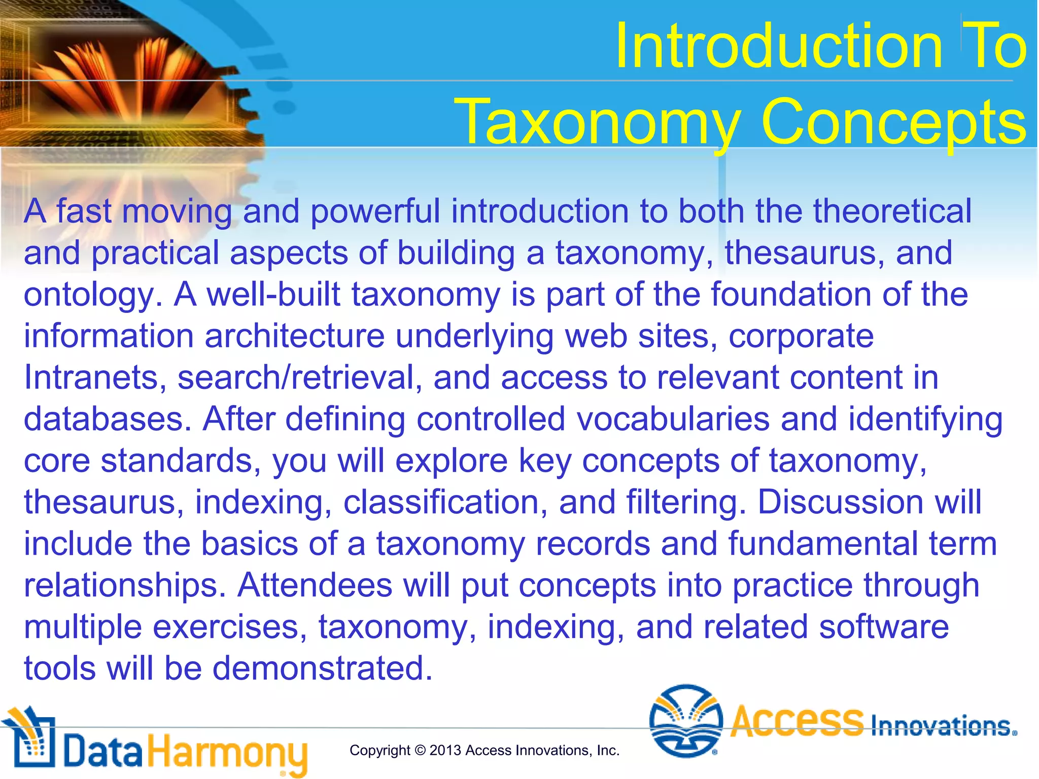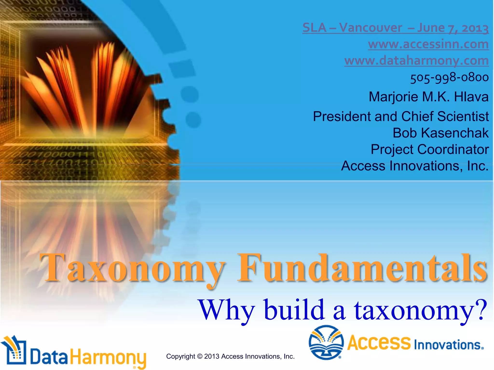 This document provides an overview of how to build a taxonomy. It discusses defining the subject field by reviewing representative content to determine core and peripheral topics. Terms are collected from sources like documents, subject matter experts, and search logs. Terms are chosen based on importance, use, specificity, and relationships. Existing taxonomies may be built upon or adopted to avoid reinventing the wheel. Formats for terms, relationships, and records are also outlined. The document provides foundational information on gathering terms and organizing a taxonomy.