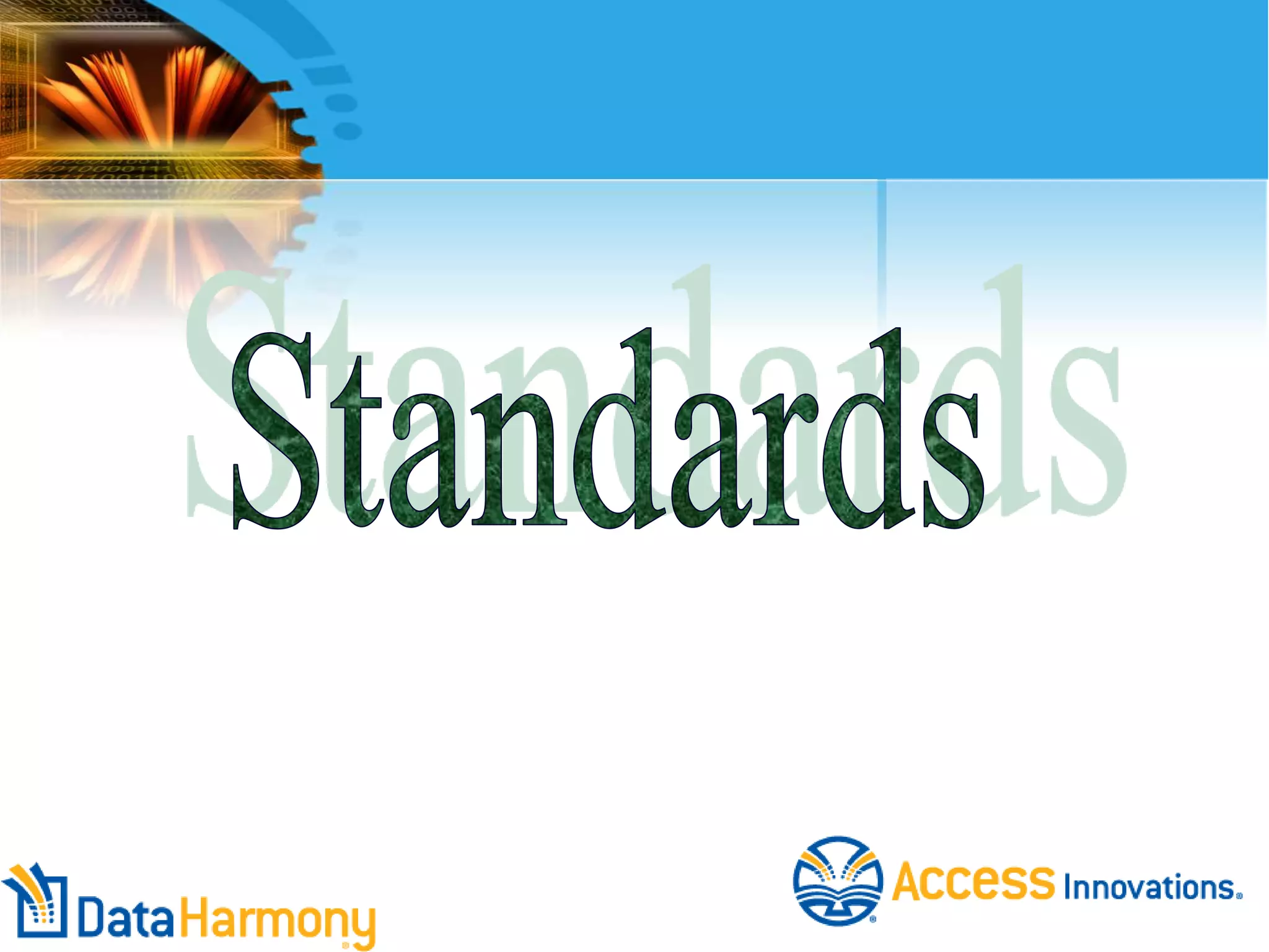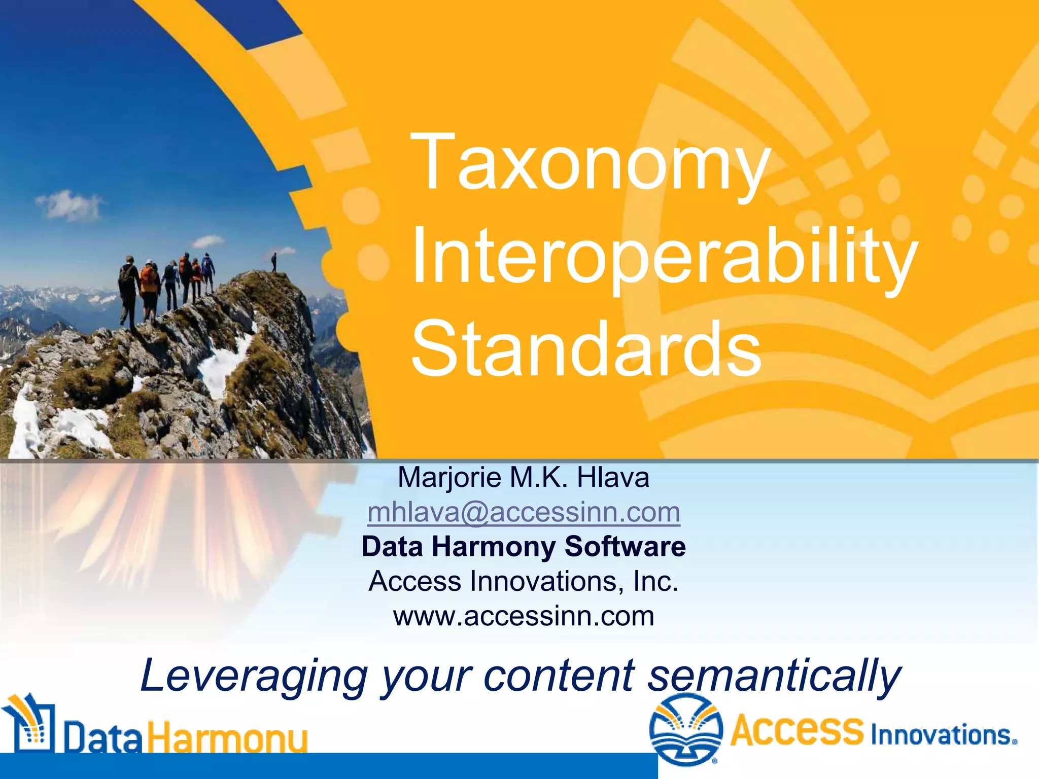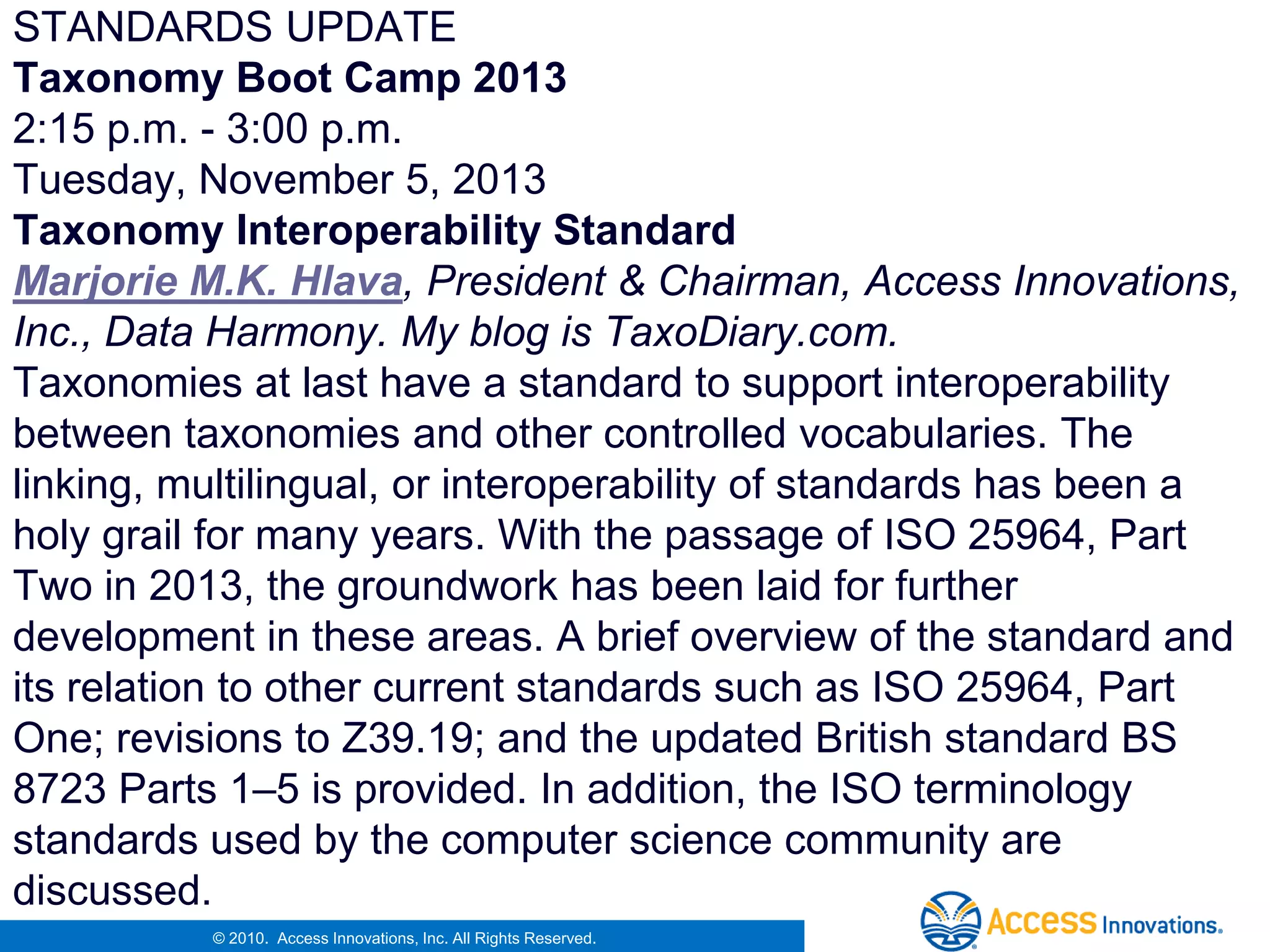 The document discusses taxonomy standards including ISO 25964, which provides guidance for building and managing thesauri and guidelines for interoperability between controlled vocabularies. It describes the history and development of taxonomy standards, key standards organizations like ISO and NISO, and standards like ISO 25964 that help different controlled vocabularies to work together.