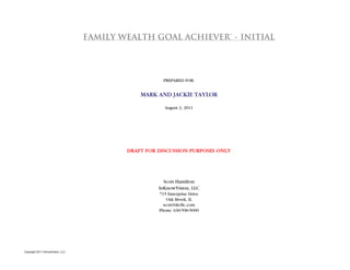 This document outlines a detailed financial and estate planning strategy for Mark and Jackie Taylor, focusing on maintaining their lifestyle, ensuring financial security for the surviving spouse, and providing for their children's inheritance. It includes creating a family limited partnership, appraising shares, establishing trusts, and converting insurance policies to maximize tax exemptions and asset protection. The plan addresses multiple strategies and tools available to achieve their wealth management and transfer goals effectively.