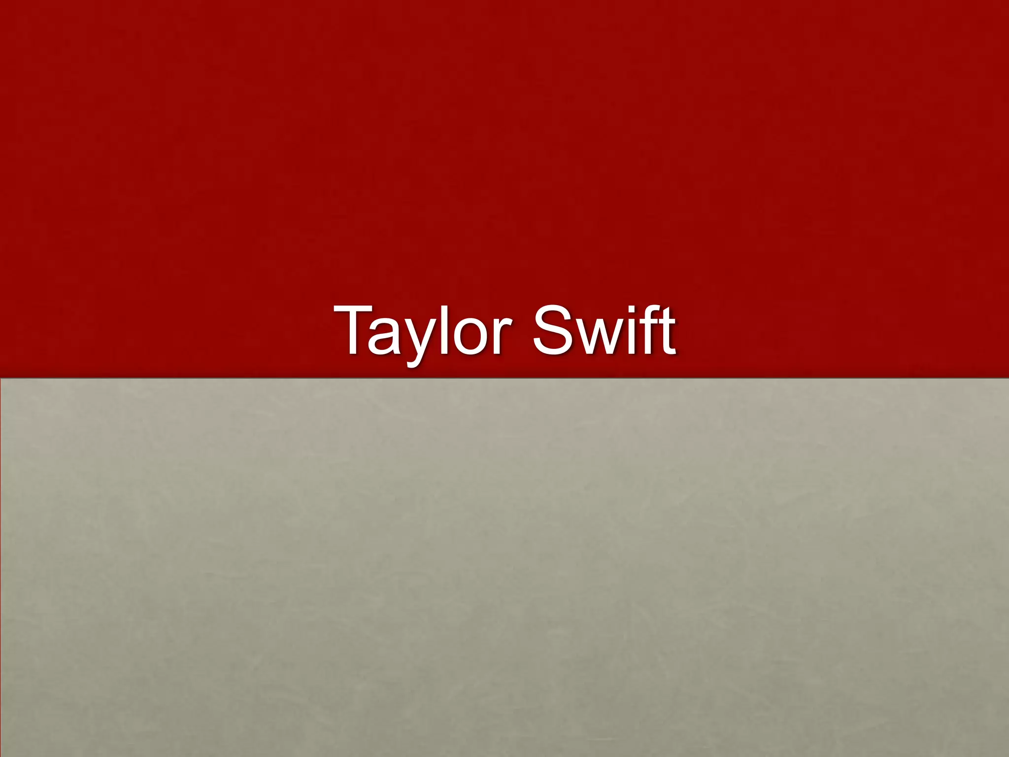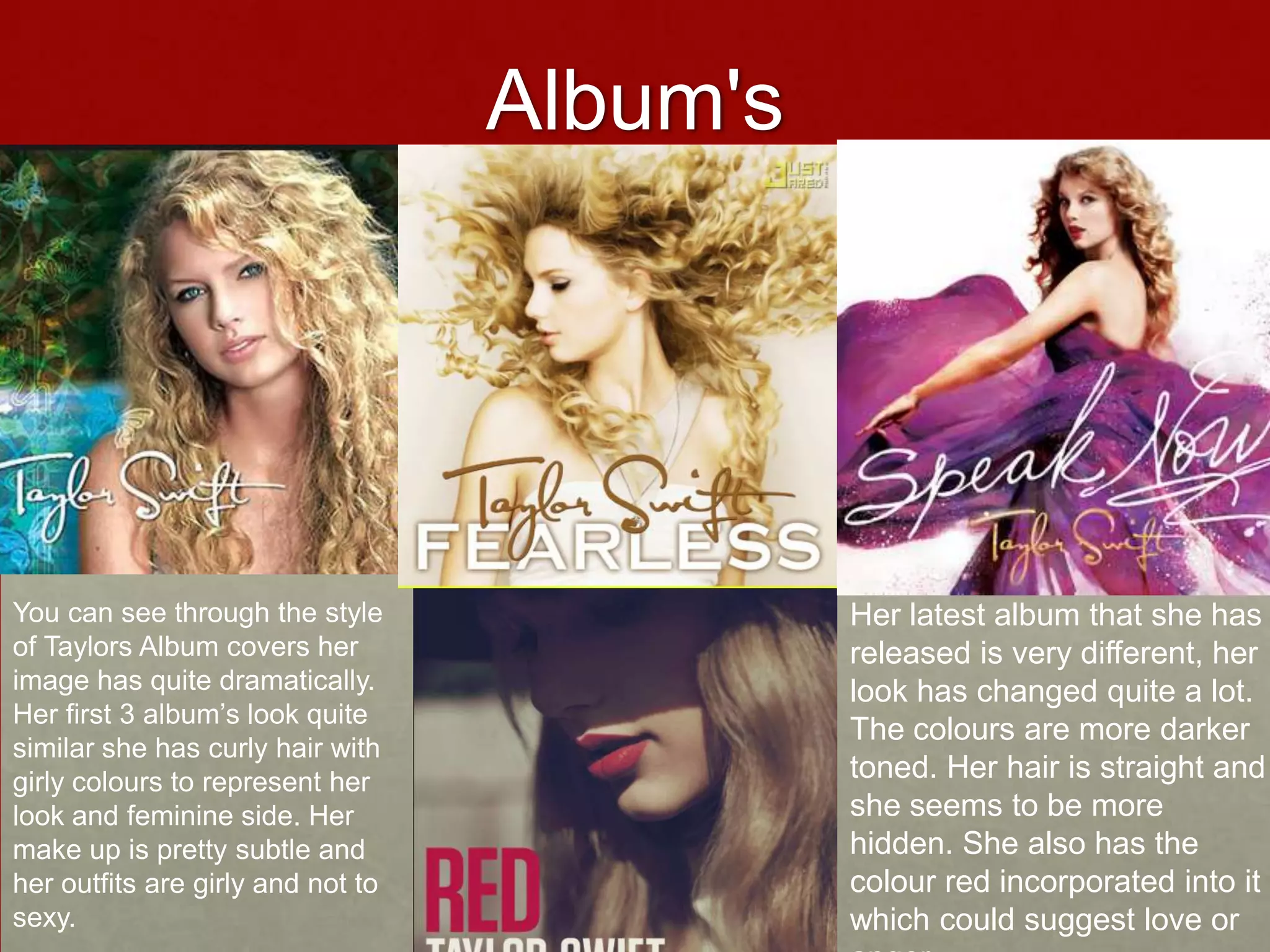 This document summarizes the evolution of Taylor Swift's image through her album covers. Her early albums portrayed a girly, feminine image with curly hair, subtle makeup, and girly outfits and colors. Her more recent album features a different, darker look with straight hair and incorporation of the color red, suggesting a more mature image. The document also contrasts lyrics from her early song "Love Story" portraying an innocent love theme to her later song "I Knew You Were Trouble" with more fierce lyrics, signifying her transition from country-pop to purely pop.