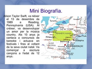 Mini Biografía. AlisonTaylor Swift, va néixer el 13 de desembre de 1989 a Reading, Pennsylvania (USA). Al créixer, va desenvolupar un amor per la música country. Als 10 anys ja cantava a concursos de kareoke i actuava en festivals i fires al voltant de la seva ciutat natal. Va començar a escriure cançons a l'edat de 12 anys.