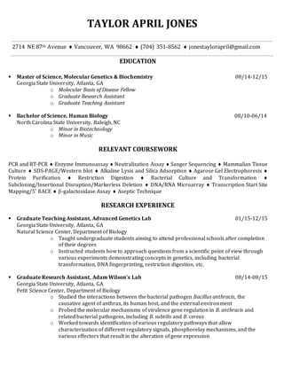 Taylor April Jones is seeking a position in molecular biology. She has a Master's degree in Molecular Genetics and Biochemistry from Georgia State University and a Bachelor's degree in Human Biology from North Carolina State University. Her research experience includes studying virulence gene regulation in Bacillus anthracis, evaluating antibody cross-neutralization between norovirus strains, and developing molecular marker technologies for wheat breeding.