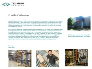 Taylored Services is a logistics and supply chain management company that has been in business since 1992. They offer a wide range of services including warehousing, distribution, transportation management, contract packaging, value-added services, and technology solutions. They have over 1 million square feet of warehouse space and can help companies design and implement end-to-end supply chain strategies to maximize effectiveness.