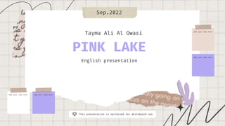This presentation discusses the pink-colored Lake Retba or Lac Rose located in Senegal, Africa. It is so named because its pink waters are caused by cyanobacteria. The lake's color changes from mauve to deep pink depending on sunlight and time of day. The lake also has a high salt content that allows people to float easily, and salt collection is an important industry on the lake. The lake has been on UNESCO's tentative World Heritage List since 2005 due to its unique pink color.