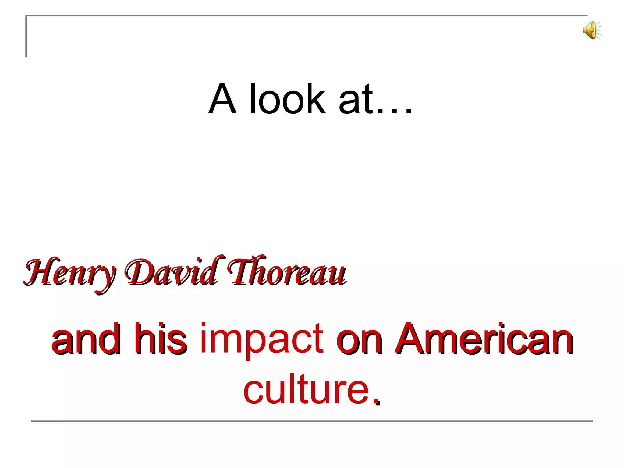 Henry David Thoreau was an American author and philosopher in the 19th century known for works such as Walden and Civil Disobedience. In Civil Disobedience, he advocated refusing to pay taxes in protest of slavery and willingly going to jail for breaking unjust laws. His experiment living simply at Walden Pond influenced transcendentalist thought and demonstrated living with few possessions. Leaders like Martin Luther King Jr. and Mahatma Gandhi drew inspiration from Thoreau's philosophy of nonviolent civil disobedience to enact social change.