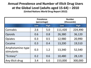 This document discusses drug use and treatment in Brazil. It provides statistics on global and Brazilian drug use prevalence. It then details the cocaine production process and test results showing high rates of cocaine adulteration in Brazil. The document discusses common cocaine adulterants like phenacetin and their health risks. It also shows rapid test results for cocaine adulterants. Finally, it discusses drug treatment evaluation results showing overall reductions in substance use after treatment.