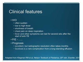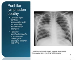 - Diagnosis relies on clinical features, radiology, tuberculin skin testing, and bacteriological confirmation through sputum/gastric aspirate sampling and culture.