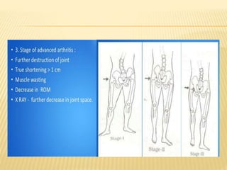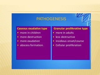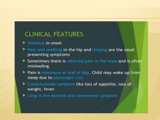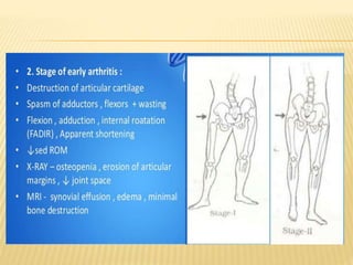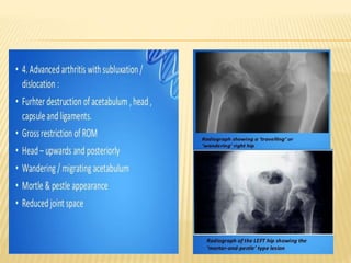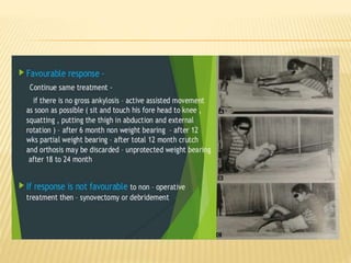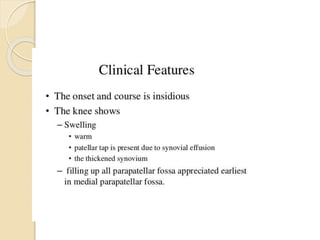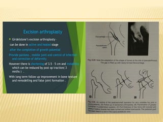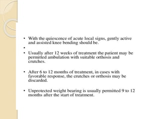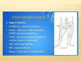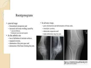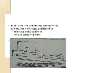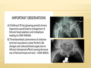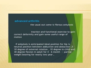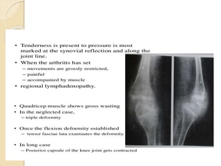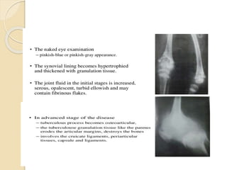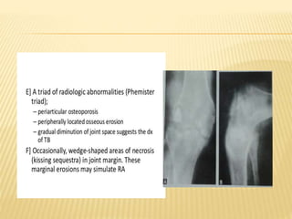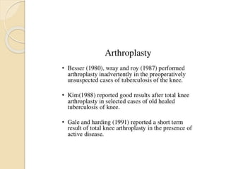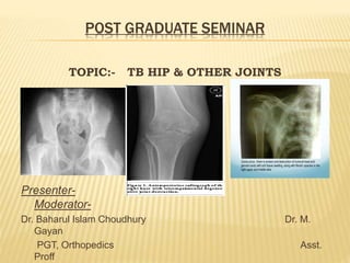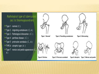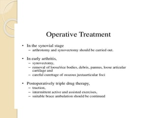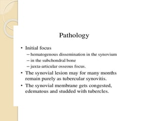This document summarizes information about tuberculosis (TB) that affects joints, including the hip, knee, ankle, shoulder, elbow, and wrist. It discusses the pathology, pathogenesis, clinical presentation, investigations, and management of TB in each of these joints. For management, it describes the use of anti-tubercular therapy along with immobilization, exercises, and in some cases, surgical interventions like synovectomy, joint debridement, or arthrodesis. The goal of treatment is to relieve symptoms, heal the infection, and restore function, while avoiding unacceptable positions of fixation or recurrence of disease.